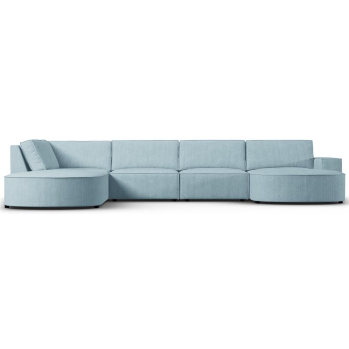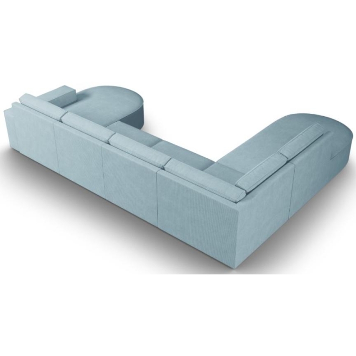 The modern Carlo panoramic 5-seater rounded corner sofa by Milo Casa is a piece of furniture with dimensions: 368 cm wide, 90 cm high, 262 cm deep on one side and 160 cm on the other, which is characterised by its extreme comfort. This trendy corner sofa is available in 8 colours: Beige, Light Blue, Dark Blue, Grey, Light Grey, Yellow, Black and Bottle Green, so it will suit any type of interior. The seat filling is made from a combination of corrugated spring and high elasticity polyurethane foam, and the backrest is filled with silicone. A distinctive feature of the sofa is its unusual, futuristic shape - the body resembles the letter 'U', making it a perfect piece of furniture for social gatherings. The sofa is upholstered with corduroy matt fabric, nice and pleasant to the touch, which ensures the highest comfort of rest. The high-quality materials used in the production of the furniture make the Carlo panoramic sofa strong and durable. The furniture is set on low, plastic legs. The longer lounger can be manufactured on the left or right side, allowing you to better adapt the furniture to your home.