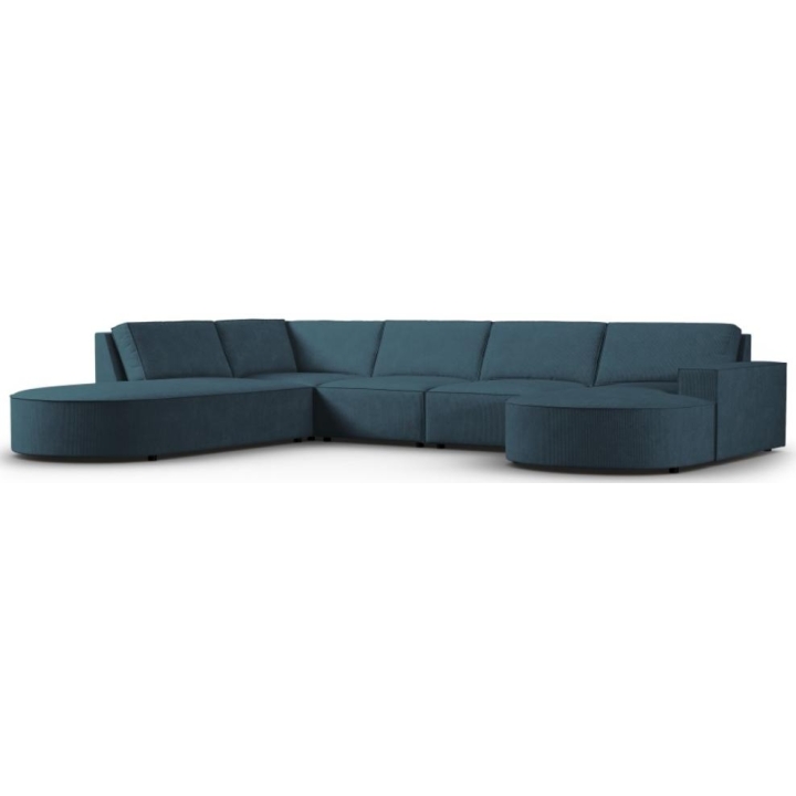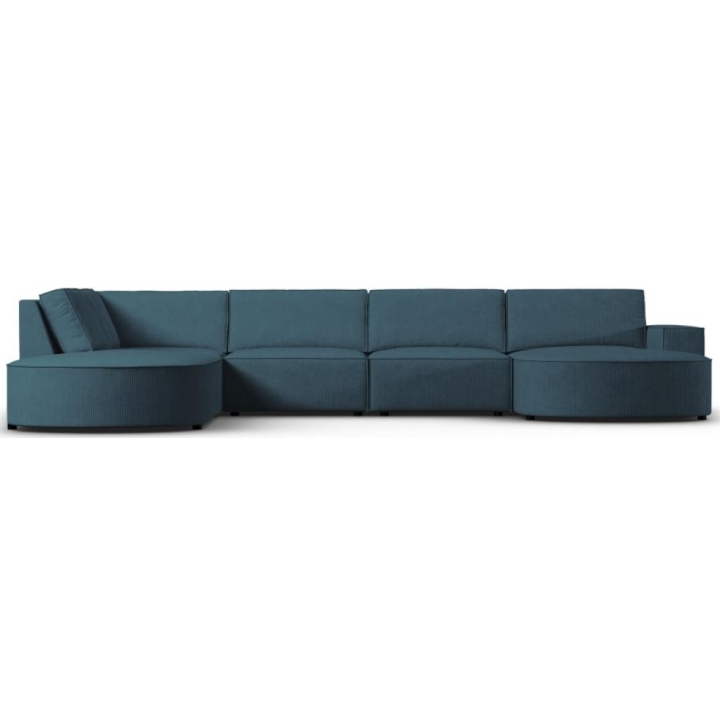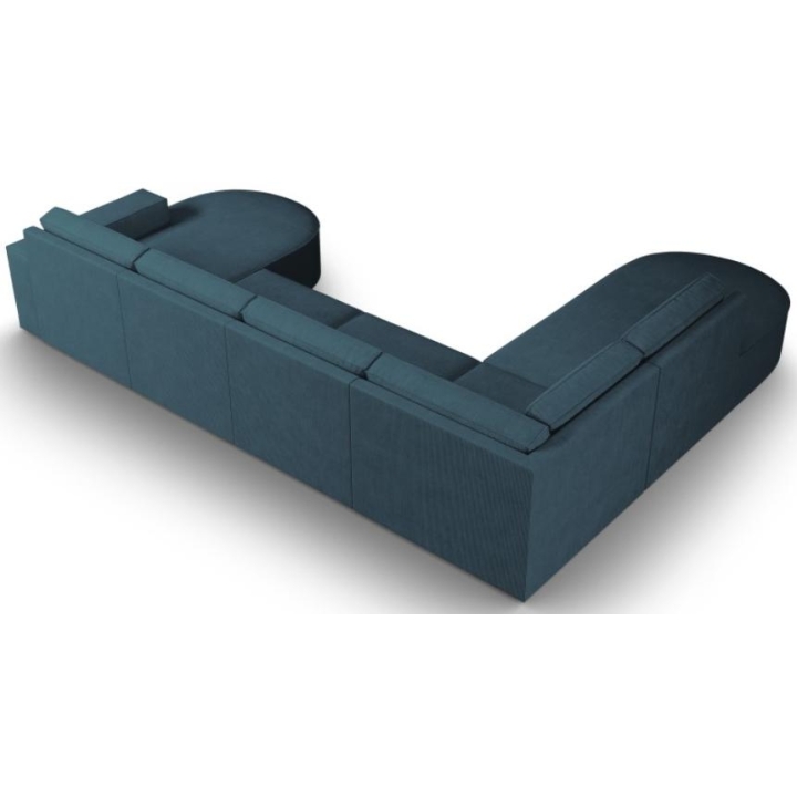 The modern Carlo panoramic 5-seater rounded corner sofa by Milo Casa is a piece of furniture with dimensions: 368 cm wide, 90 cm high, 262 cm deep on one side and 160 cm on the other, which is characterised by its extreme comfort. This trendy corner sofa is available in 8 colours: Beige, Light Blue, Dark Blue, Grey, Light Grey, Yellow, Black and Bottle Green, so it will suit any type of interior. The seat filling is made from a combination of corrugated spring and high elasticity polyurethane foam, and the backrest is filled with silicone. A distinctive feature of the sofa is its unusual, futuristic shape - the body resembles the letter 'U', making it a perfect piece of furniture for social gatherings. The sofa is upholstered with corduroy matt fabric, nice and pleasant to the touch, which ensures the highest comfort of rest. The high-quality materials used in the production of the furniture make the Carlo panoramic sofa strong and durable. The furniture is set on low, plastic legs. The longer lounger can be manufactured on the left or right side, allowing you to better adapt the furniture to your home.