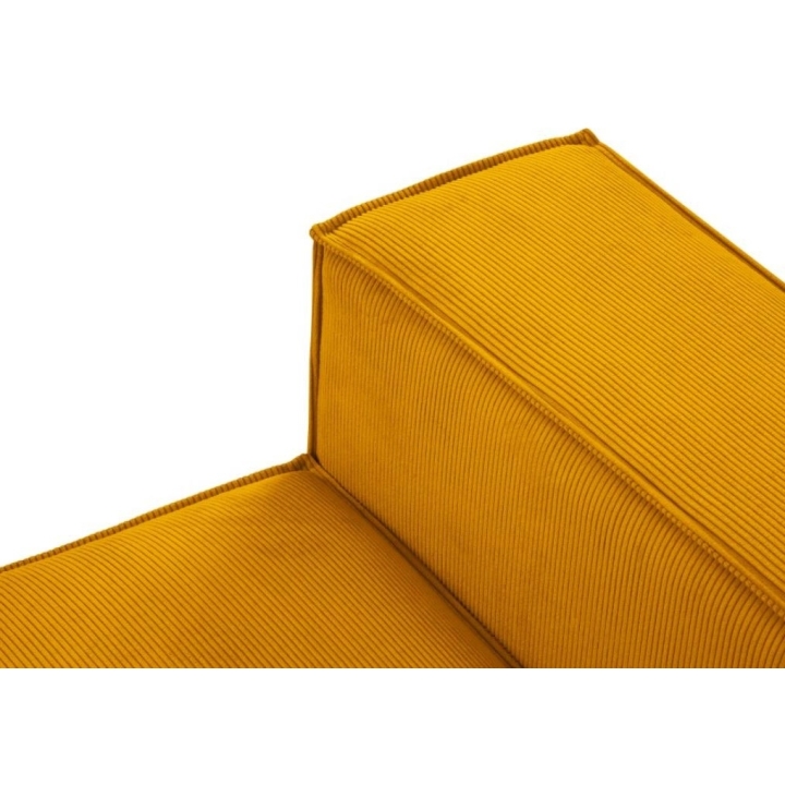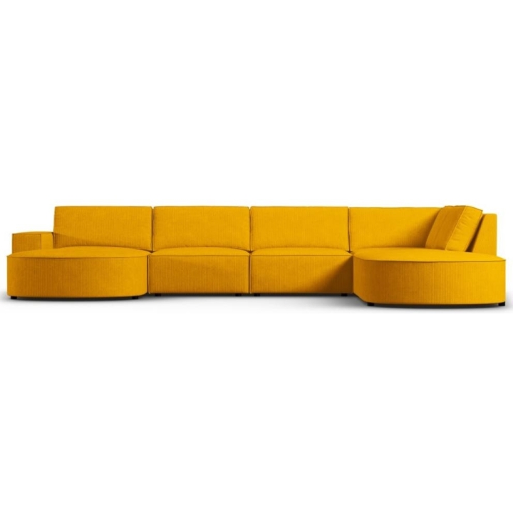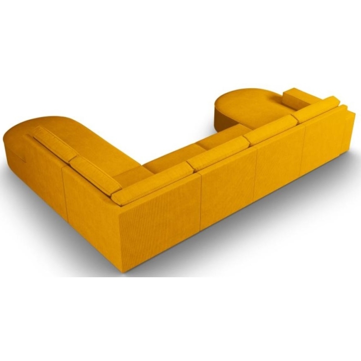 The modern Carlo panoramic 5-seater rounded corner sofa by Milo Casa is a piece of furniture with dimensions: 368 cm wide, 90 cm high, 262 cm deep on one side and 160 cm on the other, which is characterised by its extreme comfort. This trendy corner sofa is available in 8 colours: Beige, Light Blue, Dark Blue, Grey, Light Grey, Yellow, Black and Bottle Green, so it will suit any type of interior. The seat filling is made from a combination of corrugated spring and high elasticity polyurethane foam, and the backrest is filled with silicone. A distinctive feature of the sofa is its unusual, futuristic shape - the body resembles the letter 'U', making it a perfect piece of furniture for social gatherings. The sofa is upholstered with corduroy matt fabric, nice and pleasant to the touch, which ensures the highest comfort of rest. The high-quality materials used in the production of the furniture make the Carlo panoramic sofa strong and durable. The furniture is set on low, plastic legs. The longer lounger can be manufactured on the left or right side, allowing you to better adapt the furniture to your home.