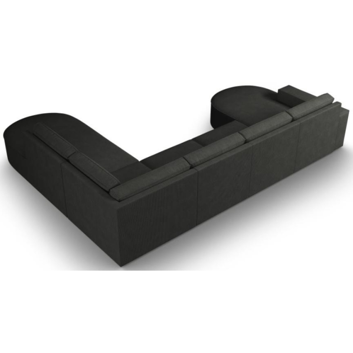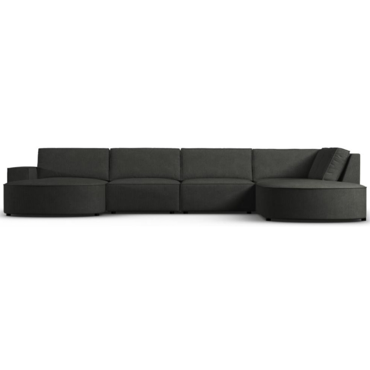 The modern Carlo panoramic 5-seater rounded corner sofa by Milo Casa is a piece of furniture with dimensions: 368 cm wide, 90 cm high, 262 cm deep on one side and 160 cm on the other, which is characterised by its extreme comfort. This trendy corner sofa is available in 8 colours: Beige, Light Blue, Dark Blue, Grey, Light Grey, Yellow, Black and Bottle Green, so it will suit any type of interior. The seat filling is made from a combination of corrugated spring and high elasticity polyurethane foam, and the backrest is filled with silicone. A distinctive feature of the sofa is its unusual, futuristic shape - the body resembles the letter 'U', making it a perfect piece of furniture for social gatherings. The sofa is upholstered with corduroy matt fabric, nice and pleasant to the touch, which ensures the highest comfort of rest. The high-quality materials used in the production of the furniture make the Carlo panoramic sofa strong and durable. The furniture is set on low, plastic legs. The longer lounger can be manufactured on the left or right side, allowing you to better adapt the furniture to your home.