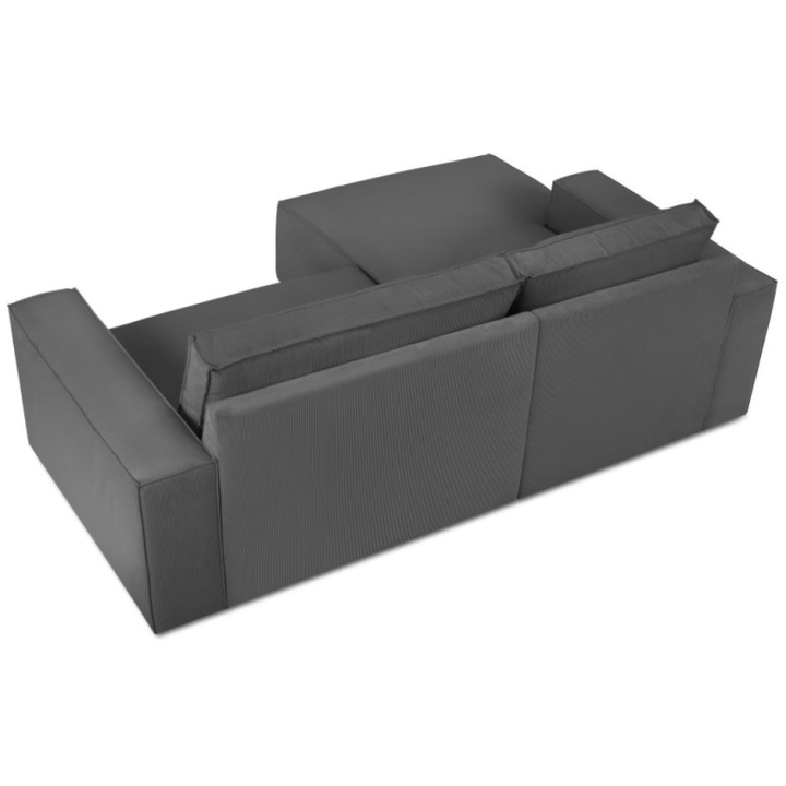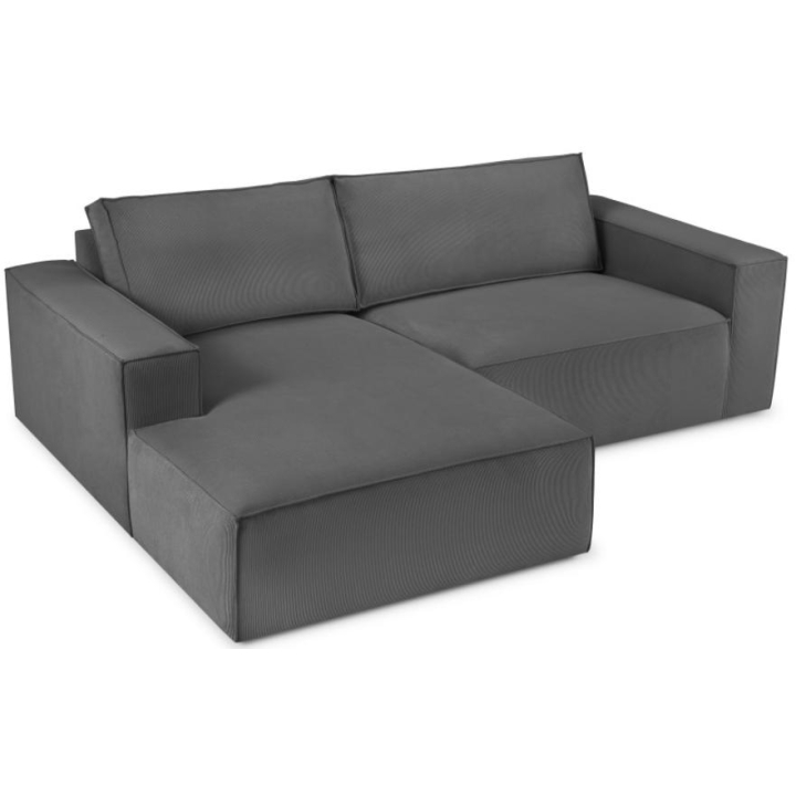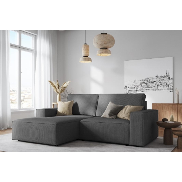 The compact Carlo 3-seater corner sofa from the manufacturer Milo Casa is a piece of furniture that measures: 229 cm wide, 90 cm high, 166 cm deep, which is characterised by its extreme comfort. This trendy corner sofa is available in 8 colours: Beige, Light Blue, Dark Blue, Grey, Light Grey, Yellow, Black and Bottle Green, so it will suit any type of interior. The seat filling is made from a combination of corrugated spring and high elasticity polyurethane foam, and the backrest is filled with silicone. A distinctive feature of the sofa is its small size, which will make it fit into most rooms. The sofa is upholstered in corduroy fabric with a matte structure made of narrow 3 mm wide stripes, which ensures the highest comfort of relaxation and is also pleasant to the touch. The high quality materials used in the production of the furniture make the Carlo corner sofa strong and durable. The furniture is set on low, plastic legs. The sofa can be manufactured on the left or on the right, so you can better adapt the furniture to your home.