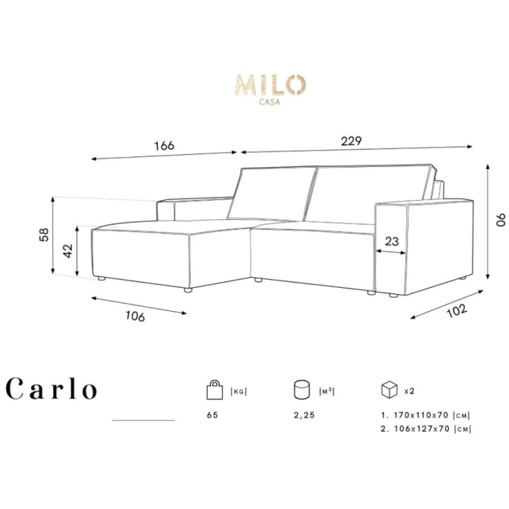 The compact Carlo 3-seater corner sofa from the manufacturer Milo Casa is a piece of furniture that measures: 229 cm wide, 90 cm high, 166 cm deep, which is characterised by its extreme comfort. This trendy corner sofa is available in 8 colours: Beige, Light Blue, Dark Blue, Grey, Light Grey, Yellow, Black and Bottle Green, so it will suit any type of interior. The seat filling is made from a combination of corrugated spring and high elasticity polyurethane foam, and the backrest is filled with silicone. A distinctive feature of the sofa is its small size, which will make it fit into most rooms. The sofa is upholstered in corduroy fabric with a matte structure made of narrow 3 mm wide stripes, which ensures the highest comfort of relaxation and is also pleasant to the touch. The high quality materials used in the production of the furniture make the Carlo corner sofa strong and durable. The furniture is set on low, plastic legs. The sofa can be manufactured on the left or on the right, so you can better adapt the furniture to your home.