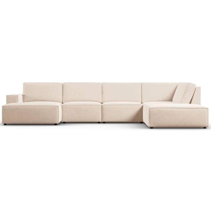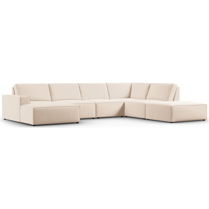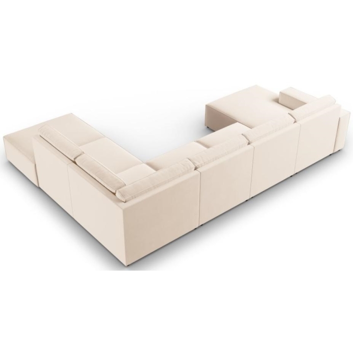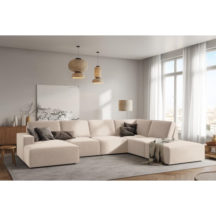 The modern Carlo 7-seater panoramic corner sofa from the manufacturer Milo Casa is a piece of furniture that measures: 366 cm wide, 90 cm high, 257 cm on one side and 166 cm deep on the other side, which is characterised by its extreme comfort. This trendy corner sofa is available in 7 colours:Light Beige, Royal Blue, Dark Blue, Grey, Light Grey, Yellow, Black and Bottle Green, so it will suit any type of interior. The seat filling is made of a combination of corrugated spring and high elasticity polyurethane foam, and the backrest is filled with silicone. A distinctive feature of the sofa is its unusual, futuristic shape - the body resembles the letter "U", making it a perfect piece of furniture for social gatherings. The sofa is upholstered with velvet fabric, silky and soft to the touch with a delicate sheen, which ensures the highest comfort of relaxation. The high quality materials used in the production of the furniture make the Carlo panoramic sofa characterised by great strength and durability. The furniture is set on low, plastic legs. The longer lounger can be manufactured on the left or right side, allowing you to better adapt the furniture to your home.