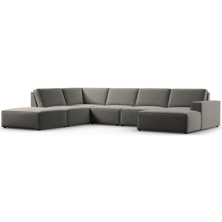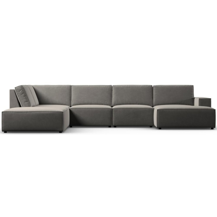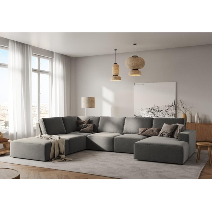 The modern Carlo 7-seater panoramic corner sofa from the manufacturer Milo Casa is a piece of furniture that measures: 366 cm wide, 90 cm high, 257 cm on one side and 166 cm deep on the other side, which is characterised by its extreme comfort. This trendy corner sofa is available in 7 colours:Light Beige, Royal Blue, Dark Blue, Grey, Light Grey, Yellow, Black and Bottle Green, so it will suit any type of interior. The seat filling is made of a combination of corrugated spring and high elasticity polyurethane foam, and the backrest is filled with silicone. A distinctive feature of the sofa is its unusual, futuristic shape - the body resembles the letter "U", making it a perfect piece of furniture for social gatherings. The sofa is upholstered with velvet fabric, silky and soft to the touch with a delicate sheen, which ensures the highest comfort of relaxation. The high quality materials used in the production of the furniture make the Carlo panoramic sofa characterised by great strength and durability. The furniture is set on low, plastic legs. The longer lounger can be manufactured on the left or right side, allowing you to better adapt the furniture to your home.