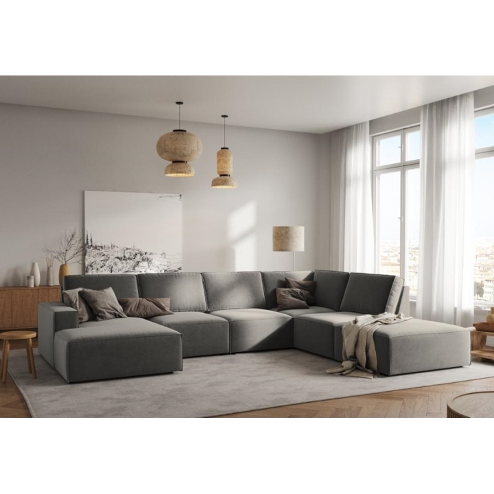 The modern Carlo 7-seater panoramic corner sofa from the manufacturer Milo Casa is a piece of furniture that measures: 366 cm wide, 90 cm high, 257 cm on one side and 166 cm deep on the other side, which is characterised by its extreme comfort. This trendy corner sofa is available in 7 colours:Light Beige, Royal Blue, Dark Blue, Grey, Light Grey, Yellow, Black and Bottle Green, so it will suit any type of interior. The seat filling is made of a combination of corrugated spring and high elasticity polyurethane foam, and the backrest is filled with silicone. A distinctive feature of the sofa is its unusual, futuristic shape - the body resembles the letter "U", making it a perfect piece of furniture for social gatherings. The sofa is upholstered with velvet fabric, silky and soft to the touch with a delicate sheen, which ensures the highest comfort of relaxation. The high quality materials used in the production of the furniture make the Carlo panoramic sofa characterised by great strength and durability. The furniture is set on low, plastic legs. The longer lounger can be manufactured on the left or right side, allowing you to better adapt the furniture to your home.