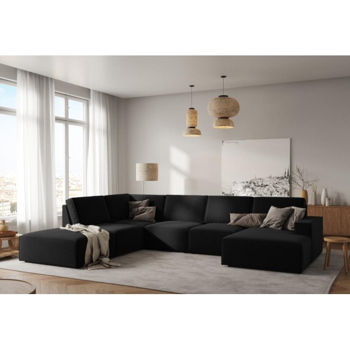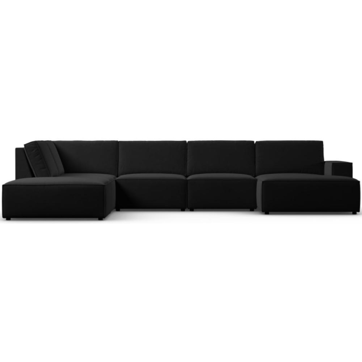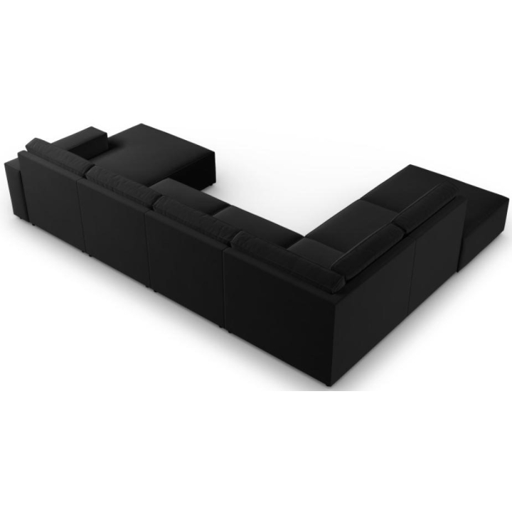 The modern Carlo 7-seater panoramic corner sofa from the manufacturer Milo Casa is a piece of furniture that measures: 366 cm wide, 90 cm high, 257 cm on one side and 166 cm deep on the other side, which is characterised by its extreme comfort. This trendy corner sofa is available in 7 colours:Light Beige, Royal Blue, Dark Blue, Grey, Light Grey, Yellow, Black and Bottle Green, so it will suit any type of interior. The seat filling is made of a combination of corrugated spring and high elasticity polyurethane foam, and the backrest is filled with silicone. A distinctive feature of the sofa is its unusual, futuristic shape - the body resembles the letter "U", making it a perfect piece of furniture for social gatherings. The sofa is upholstered with velvet fabric, silky and soft to the touch with a delicate sheen, which ensures the highest comfort of relaxation. The high quality materials used in the production of the furniture make the Carlo panoramic sofa characterised by great strength and durability. The furniture is set on low, plastic legs. The longer lounger can be manufactured on the left or right side, allowing you to better adapt the furniture to your home.