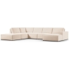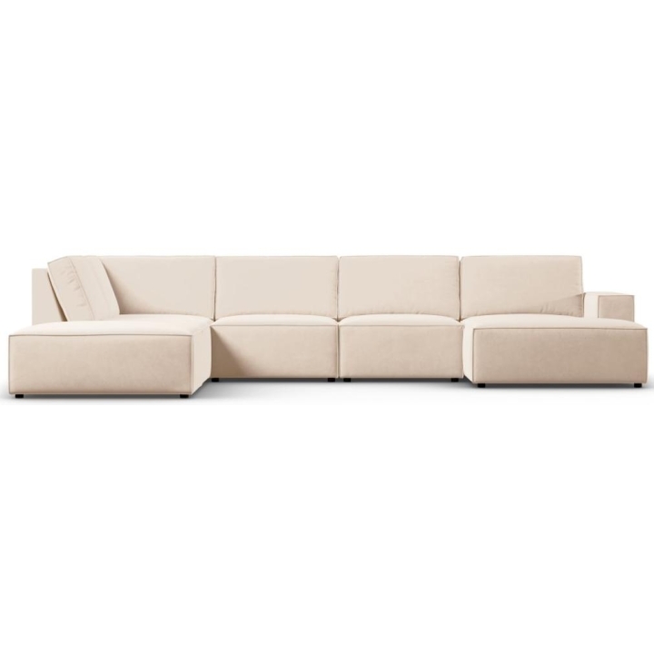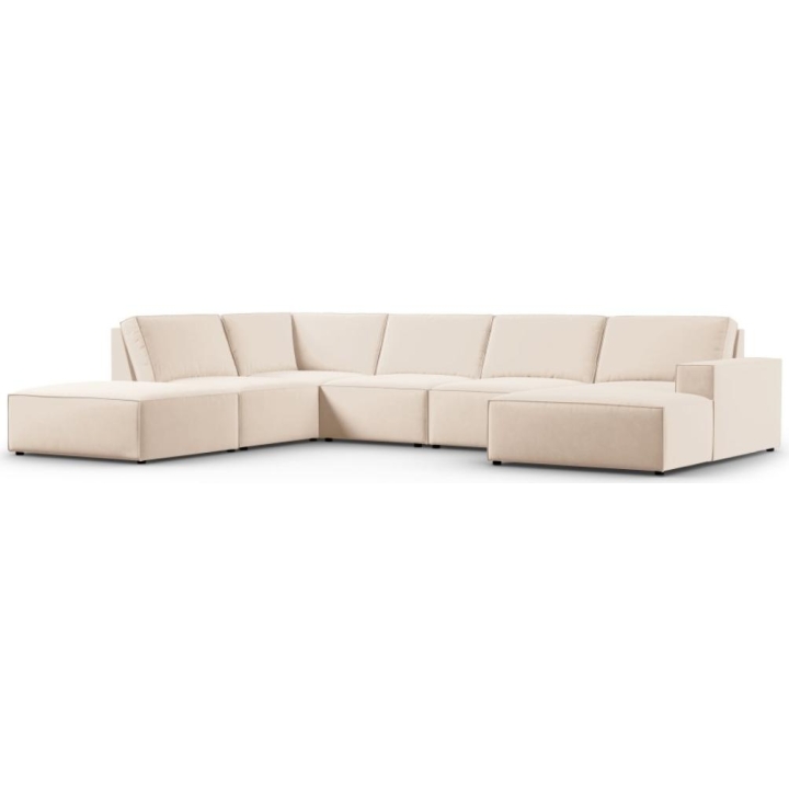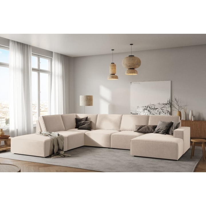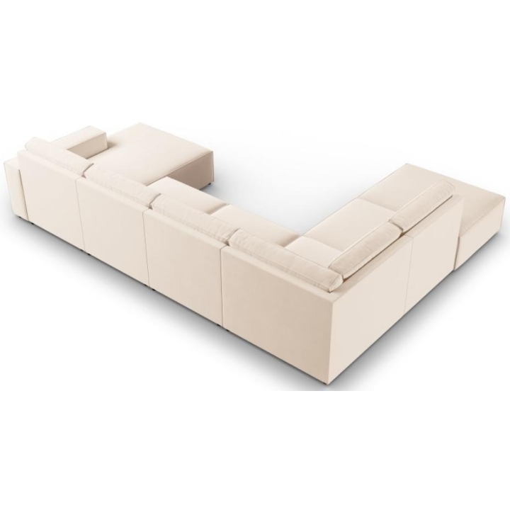 The modern Carlo 7-seater panoramic corner sofa from the manufacturer Milo Casa is a piece of furniture that measures: 366 cm wide, 90 cm high, 257 cm on one side and 166 cm deep on the other side, which is characterised by its extreme comfort. This trendy corner sofa is available in 7 colours:Light Beige, Royal Blue, Dark Blue, Grey, Light Grey, Yellow, Black and Bottle Green, so it will suit any type of interior. The seat filling is made of a combination of corrugated spring and high elasticity polyurethane foam, and the backrest is filled with silicone. A distinctive feature of the sofa is its unusual, futuristic shape - the body resembles the letter "U", making it a perfect piece of furniture for social gatherings. The sofa is upholstered with velvet fabric, silky and soft to the touch with a delicate sheen, which ensures the highest comfort of relaxation. The high quality materials used in the production of the furniture make the Carlo panoramic sofa characterised by great strength and durability. The furniture is set on low, plastic legs. The longer lounger can be manufactured on the left or right side, allowing you to better adapt the furniture to your home.