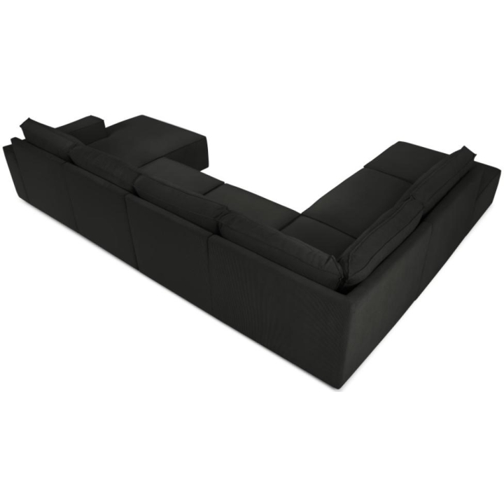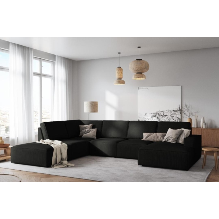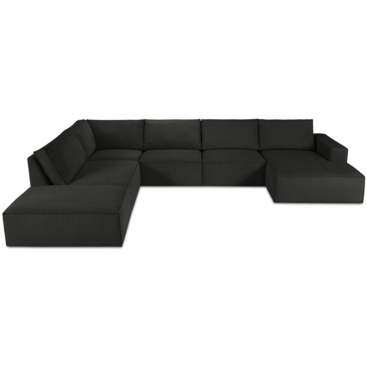 The modern Carlo 7-seater panoramic corner sofa from the manufacturer Milo Casa is a piece of furniture that measures: 366 cm wide, 90 cm high, 257 cm on one side and 166 cm deep on the other side, which is characterised by its extreme comfort. This trendy corner sofa is available in 8 colours: Beige, Light Blue, Dark Blue, Grey, Light Grey, Yellow, Black and Bottle Green, so it will suit any type of interior. The seat filling is made from a combination of corrugated spring and high elasticity polyurethane foam, and the backrest is filled with silicone. A distinctive feature of the sofa is its unusual, futuristic shape - the body resembles the letter 'U', making it a perfect piece of furniture for social gatherings. The sofa is upholstered with corduroy fabric with a matte structure made of narrow 3 mm wide stripes, which adds elegance to the piece and additionally ensures the highest comfort of relaxation. The high quality materials used in the production of the furniture make the Carlo panoramic sofa characterised by great strength and durability. The furniture is set on low, plastic legs. The longer lounger can be manufactured on the left or right side, allowing you to better adapt the furniture to your home.