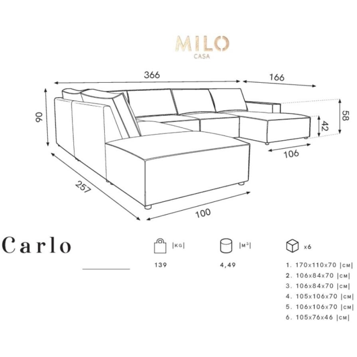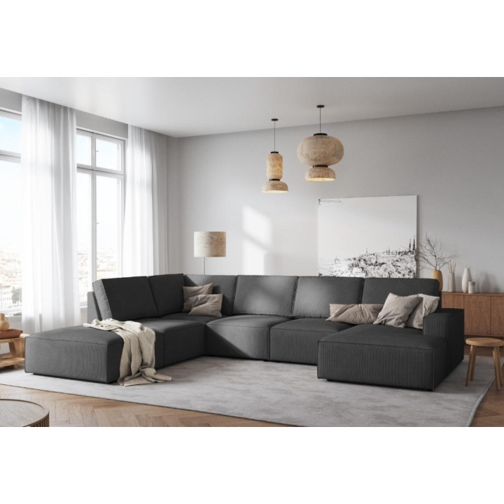 The modern Carlo 7-seater panoramic corner sofa from the manufacturer Milo Casa is a piece of furniture that measures: 366 cm wide, 90 cm high, 257 cm on one side and 166 cm deep on the other side, which is characterised by its extreme comfort. This trendy corner sofa is available in 8 colours: Beige, Light Blue, Dark Blue, Grey, Light Grey, Yellow, Black and Bottle Green, so it will suit any type of interior. The seat filling is made from a combination of corrugated spring and high elasticity polyurethane foam, and the backrest is filled with silicone. A distinctive feature of the sofa is its unusual, futuristic shape - the body resembles the letter 'U', making it a perfect piece of furniture for social gatherings. The sofa is upholstered with corduroy fabric with a matte structure made of narrow 3 mm wide stripes, which adds elegance to the piece and additionally ensures the highest comfort of relaxation. The high quality materials used in the production of the furniture make the Carlo panoramic sofa characterised by great strength and durability. The furniture is set on low, plastic legs. The longer lounger can be manufactured on the left or right side, allowing you to better adapt the furniture to your home.