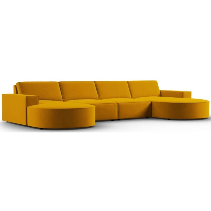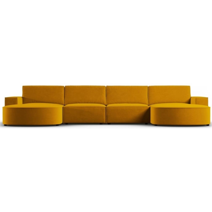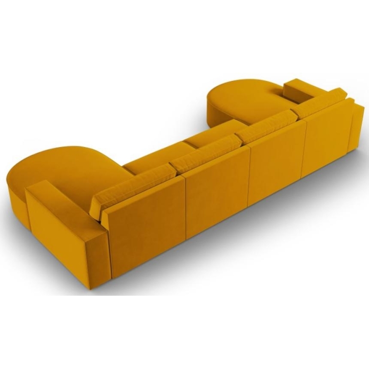 The modern panoramic 5-seater Carlo rounded corner sofa from the manufacturer Milo Casa is a piece of furniture that measures: 372 cm wide, 90 cm high, 166 cm deep on both sides, which is characterised by its extreme comfort. This trendy corner sofa is available in 7 colours: Light Beige, Royal Blue, Grey, Light Grey, Yellow, Black and Bottle Green, so it will suit any type of interior. The seat filling is made from a combination of corrugated spring and high elasticity polyurethane foam, while the backrest is filled with silicone. A distinctive feature of the sofa is its unusual, futuristic shape - the body resembles the letter 'U', making it a perfect piece of furniture for social gatherings. In addition, the loungers have been rounded, which makes it a unique proposal. The sofa has been upholstered with velvet fabric that is silky and extremely soft to the touch, ensuring the ultimate comfort of rest. The high quality materials used in the production of the furniture make the Carlo panoramic sofa characterised by great strength and durability. The furniture is set on low, plastic legs.