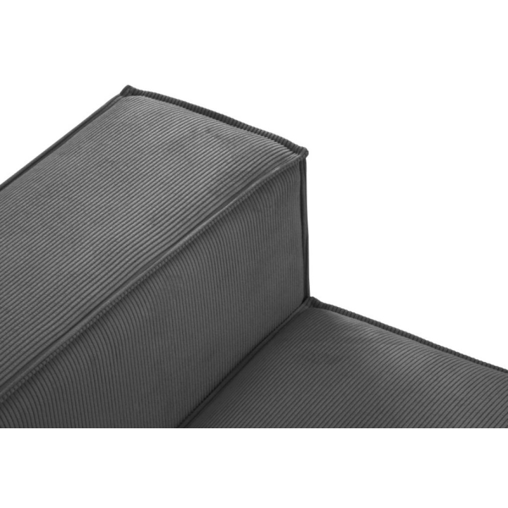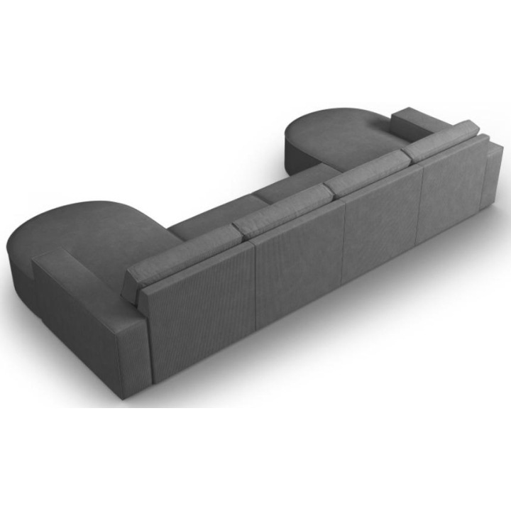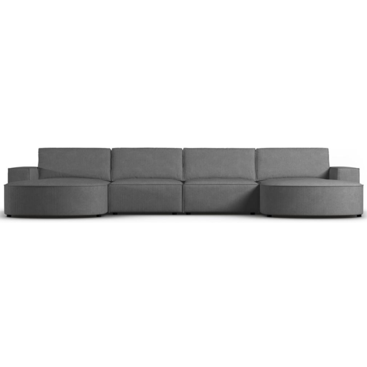 Modern panoramic corner sofa 5 seater. Carlo rounded by the manufacturer Milo Casa is a piece of furniture with dimensions: 372 cm wide, 90 cm high, 166 cm deep on both sides, which is characterised by its extreme comfort. This trendy corner sofa is available in 8 colours: Beige, Light Blue, Dark Blue, Grey, Light Grey, Yellow, Black and Bottle Green, so it will suit any type of interior. The seat filling is made from a combination of corrugated spring and high elasticity polyurethane foam, and the backrest is filled with silicone. A distinctive feature of the sofa is its unusual, futuristic shape - the body resembles the letter 'U', making it a perfect piece of furniture for social gatherings. Additionally, the loungers have been rounded, which makes it a unique proposal. The sofa has been upholstered with a corduroy fabric with a matt structure made of narrow strips 3mm wide, which ensures the highest comfort of rest. The high quality materials used in the production of the furniture make the Carlo panoramic sofa characterised by great strength and durability. The furniture is set on low, plastic legs.