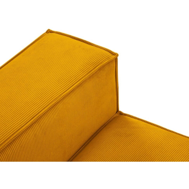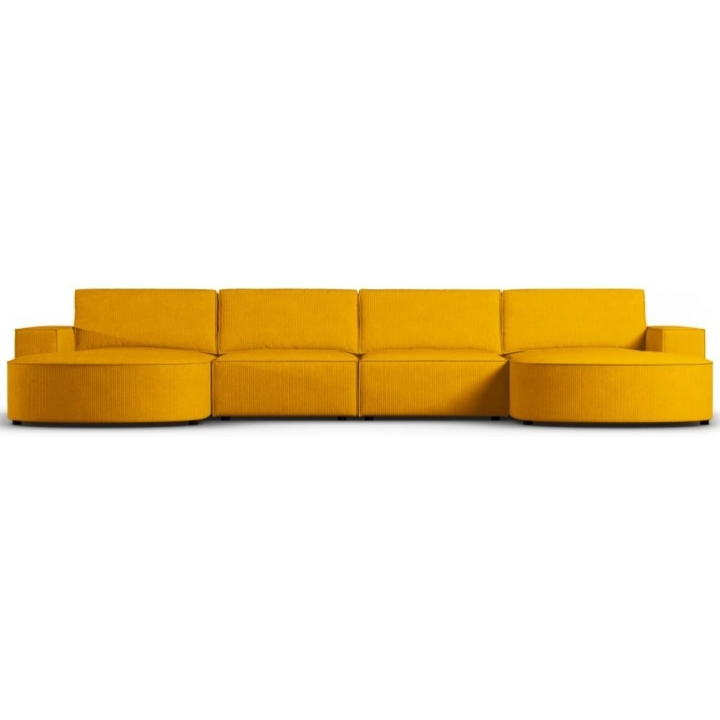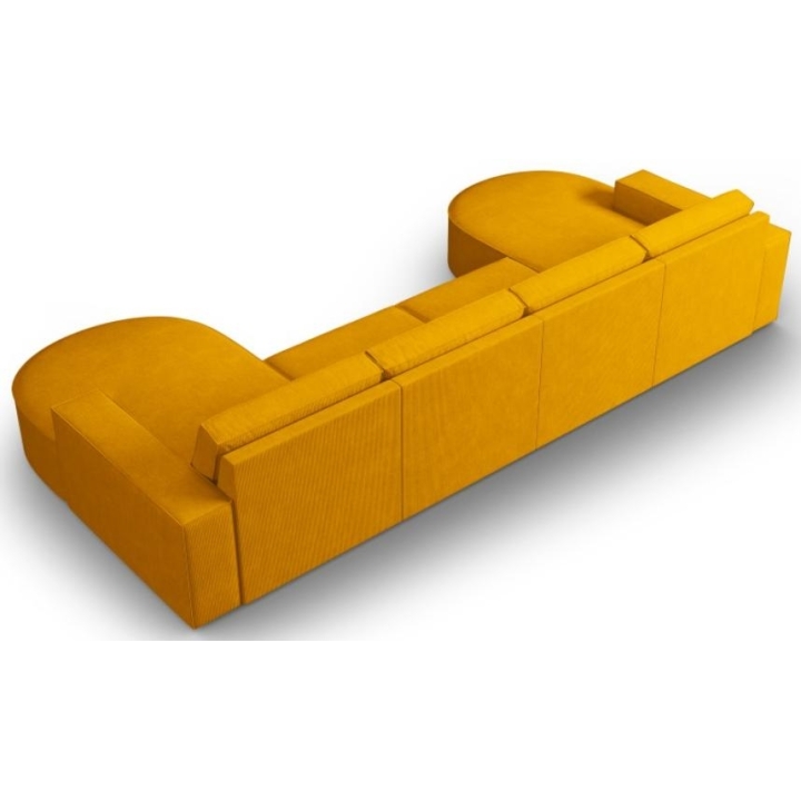 Modern panoramic corner sofa 5 seater. Carlo rounded by the manufacturer Milo Casa is a piece of furniture with dimensions: 372 cm wide, 90 cm high, 166 cm deep on both sides, which is characterised by its extreme comfort. This trendy corner sofa is available in 8 colours: Beige, Light Blue, Dark Blue, Grey, Light Grey, Yellow, Black and Bottle Green, so it will suit any type of interior. The seat filling is made from a combination of corrugated spring and high elasticity polyurethane foam, and the backrest is filled with silicone. A distinctive feature of the sofa is its unusual, futuristic shape - the body resembles the letter 'U', making it a perfect piece of furniture for social gatherings. Additionally, the loungers have been rounded, which makes it a unique proposal. The sofa has been upholstered with a corduroy fabric with a matt structure made of narrow strips 3mm wide, which ensures the highest comfort of rest. The high quality materials used in the production of the furniture make the Carlo panoramic sofa characterised by great strength and durability. The furniture is set on low, plastic legs.