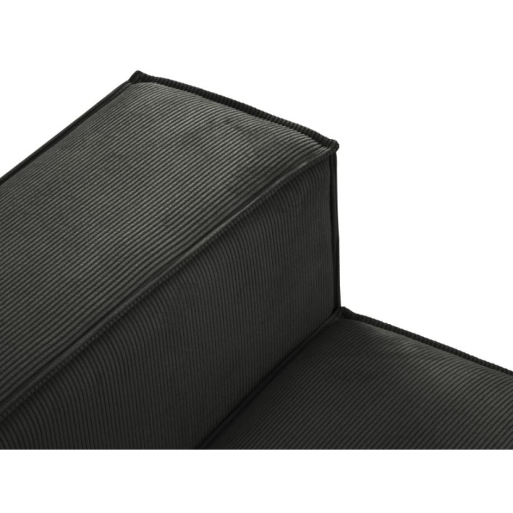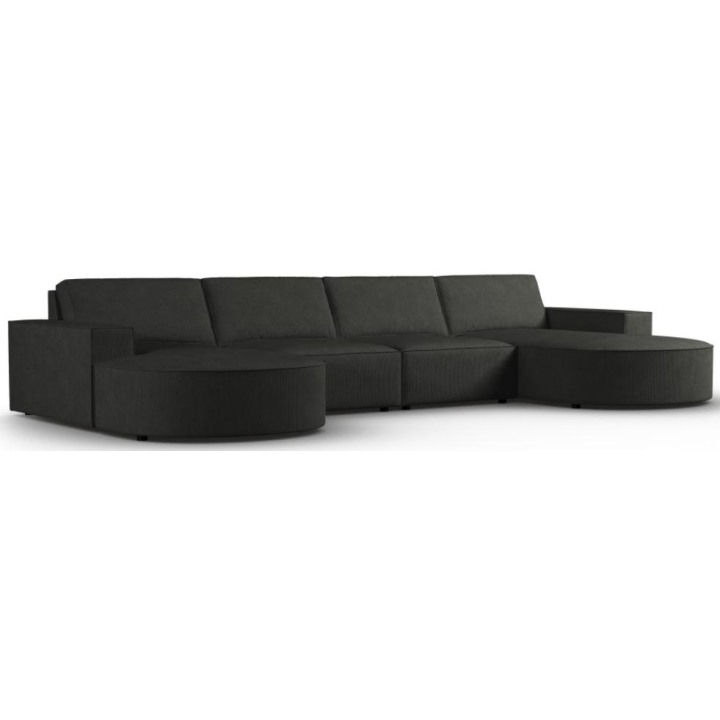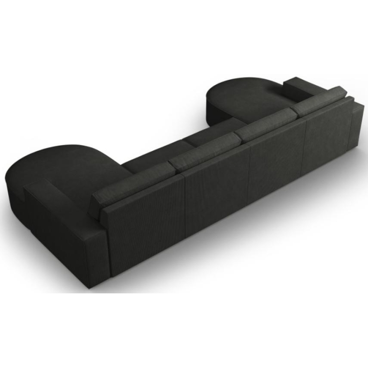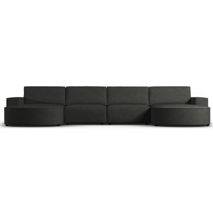 Modern panoramic corner sofa 5 seater. Carlo rounded by the manufacturer Milo Casa is a piece of furniture with dimensions: 372 cm wide, 90 cm high, 166 cm deep on both sides, which is characterised by its extreme comfort. This trendy corner sofa is available in 8 colours: Beige, Light Blue, Dark Blue, Grey, Light Grey, Yellow, Black and Bottle Green, so it will suit any type of interior. The seat filling is made from a combination of corrugated spring and high elasticity polyurethane foam, and the backrest is filled with silicone. A distinctive feature of the sofa is its unusual, futuristic shape - the body resembles the letter 'U', making it a perfect piece of furniture for social gatherings. Additionally, the loungers have been rounded, which makes it a unique proposal. The sofa has been upholstered with a corduroy fabric with a matt structure made of narrow strips 3mm wide, which ensures the highest comfort of rest. The high quality materials used in the production of the furniture make the Carlo panoramic sofa characterised by great strength and durability. The furniture is set on low, plastic legs.