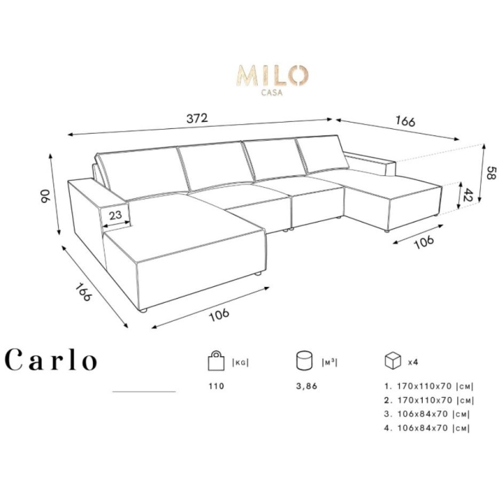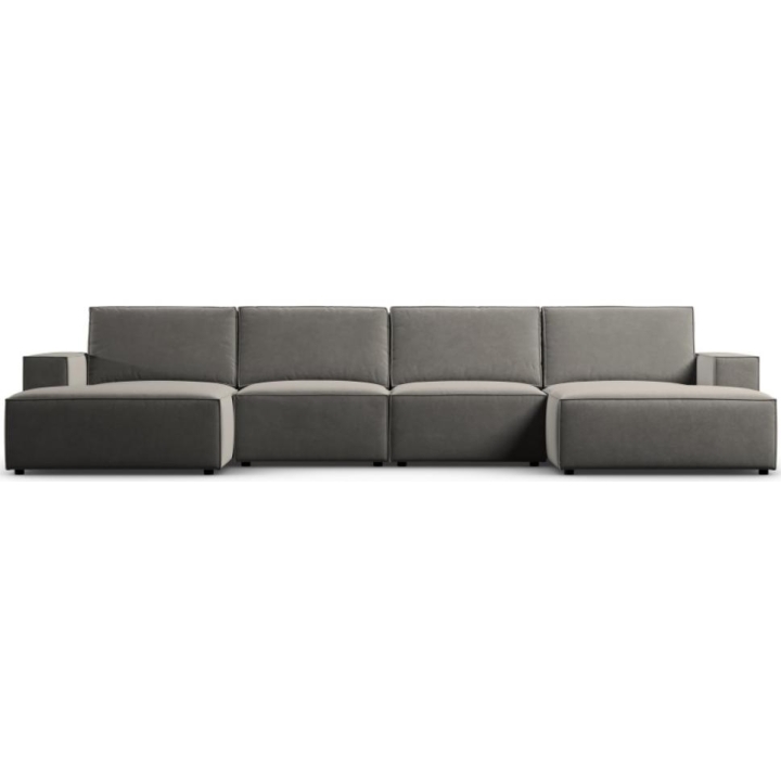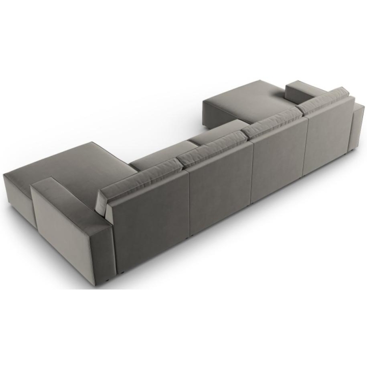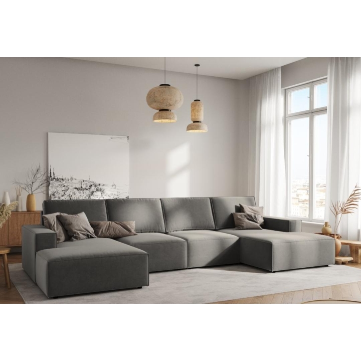 The modern panoramic sofa 5 seater. Carlo by the manufacturer Milo Casa is a piece of furniture with dimensions: 372 cm wide, 90 cm high, 166 cm deep on both sides which is characterised by its extreme comfort. This trendy corner sofa is available in 7 colours: Light Beige, Royal Blue, Grey, Light Grey, Yellow, Black and Bottle Green, so it will suit any type of interior. The seat filling is made from a combination of corrugated spring and high elasticity polyurethane foam, while the backrest is filled with silicone. A distinctive feature of the sofa is its unusual, futuristic shape - the body resembles the letter 'U', making it a perfect piece of furniture for social gatherings. In addition, the loungers are of equal length, which will please all lovers of symmetry. The sofa has been upholstered with velvet fabric, which ensures the highest comfort of rest and is silky and pleasant to the touch. The high-quality materials used in the production of the furniture make the Carlo panoramic sofa characterised by great strength and durability. The furniture is set on low, plastic legs.