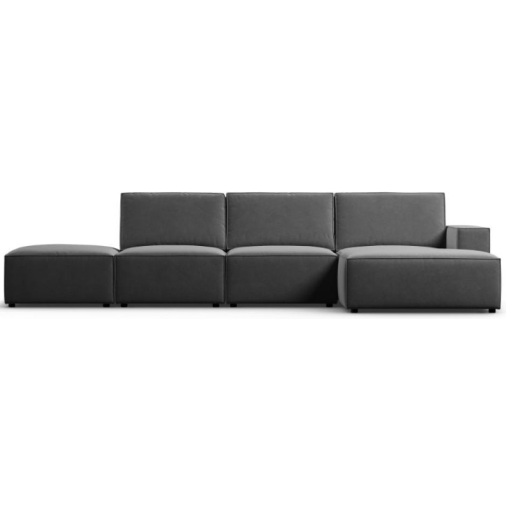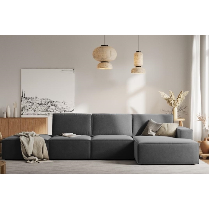 The stylish corner sofa 5 seater. Carlo by the manufacturer Milo Casais a piece of furniture with dimensions: 341 cm wide, 90 cm high, 166 cm deep, which is characterised by its extreme comfort. This trendy corner sofa is available in 7 colours: Light Beige, Royal Blue, Grey, Light Grey, Yellow, Black and Bottle Green, so it will suit any type of interior. The seat filling is made of a combination of corrugated spring and high elasticity polyurethane foam, and the backrest is filled with silicone. The sofa is distinguished by its unusual, futuristic shape - it does not have a single backrest, which makes it more spacious. The piece of furniture is upholstered with velvet fabric, silky and pleasant to the touch with a delicate sheen, which ensures the highest comfort of relaxation and is also resistant to abrasion. Martindale test of 50,000 cycles. The high-quality materials used in the production of the furniture make the Carlo corner sofa characterised by high strength and durability. The furniture is set on low, plastic legs. The sofa can be manufactured on the left or on the right, so you can better adapt the furniture to your home.