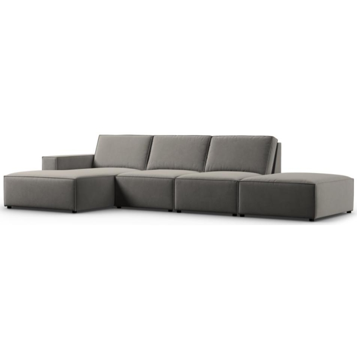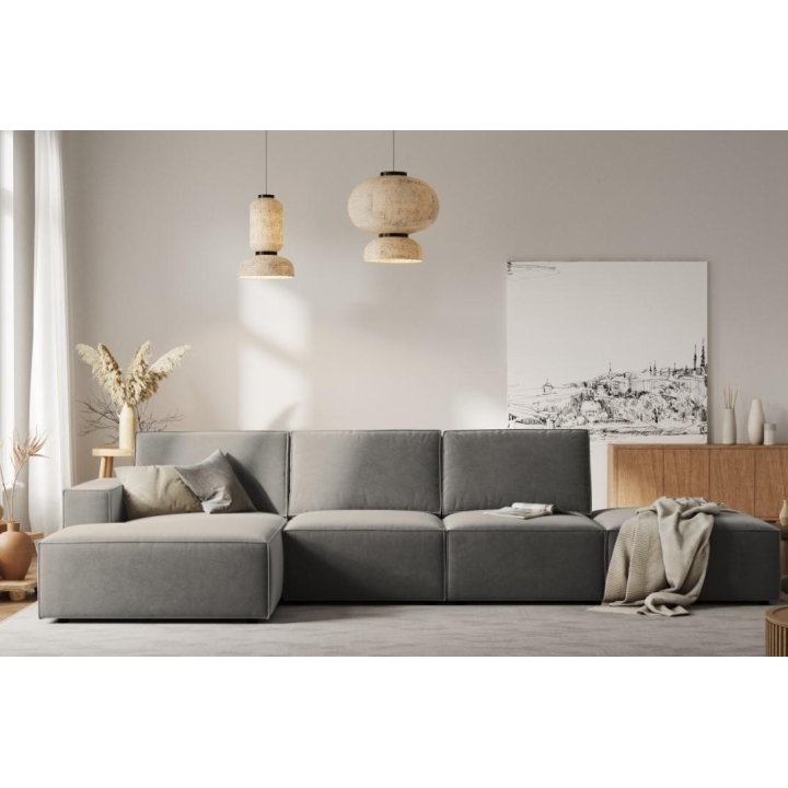 The stylish corner sofa 5 seater. Carlo by the manufacturer Milo Casais a piece of furniture with dimensions: 341 cm wide, 90 cm high, 166 cm deep, which is characterised by its extreme comfort. This trendy corner sofa is available in 7 colours: Light Beige, Royal Blue, Grey, Light Grey, Yellow, Black and Bottle Green, so it will suit any type of interior. The seat filling is made of a combination of corrugated spring and high elasticity polyurethane foam, and the backrest is filled with silicone. The sofa is distinguished by its unusual, futuristic shape - it does not have a single backrest, which makes it more spacious. The piece of furniture is upholstered with velvet fabric, silky and pleasant to the touch with a delicate sheen, which ensures the highest comfort of relaxation and is also resistant to abrasion. Martindale test of 50,000 cycles. The high-quality materials used in the production of the furniture make the Carlo corner sofa characterised by high strength and durability. The furniture is set on low, plastic legs. The sofa can be manufactured on the left or on the right, so you can better adapt the furniture to your home.