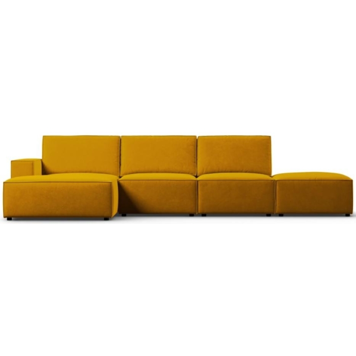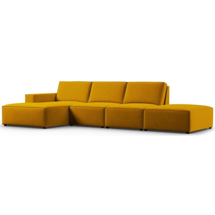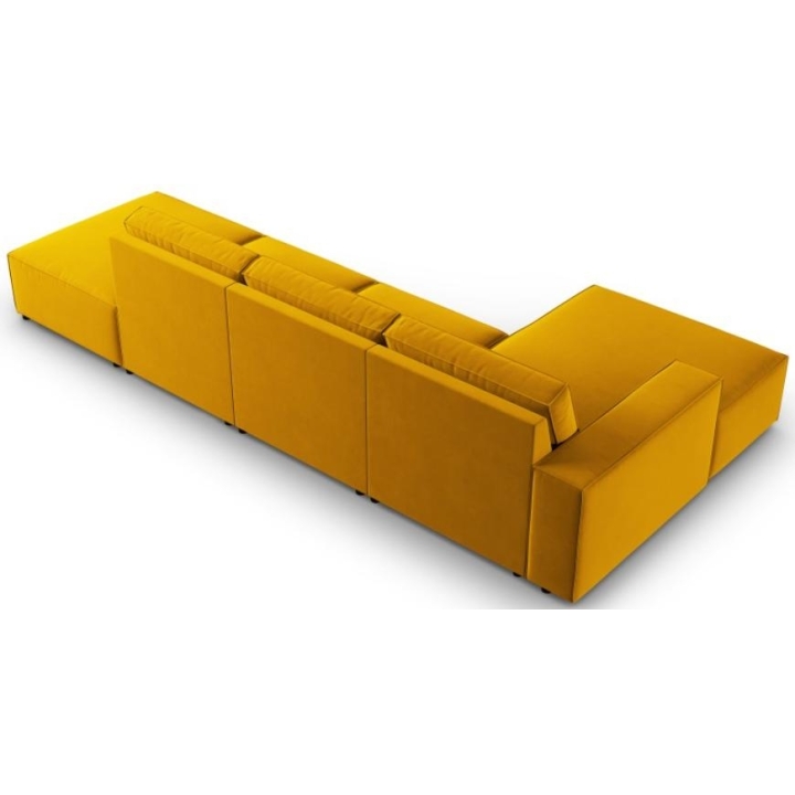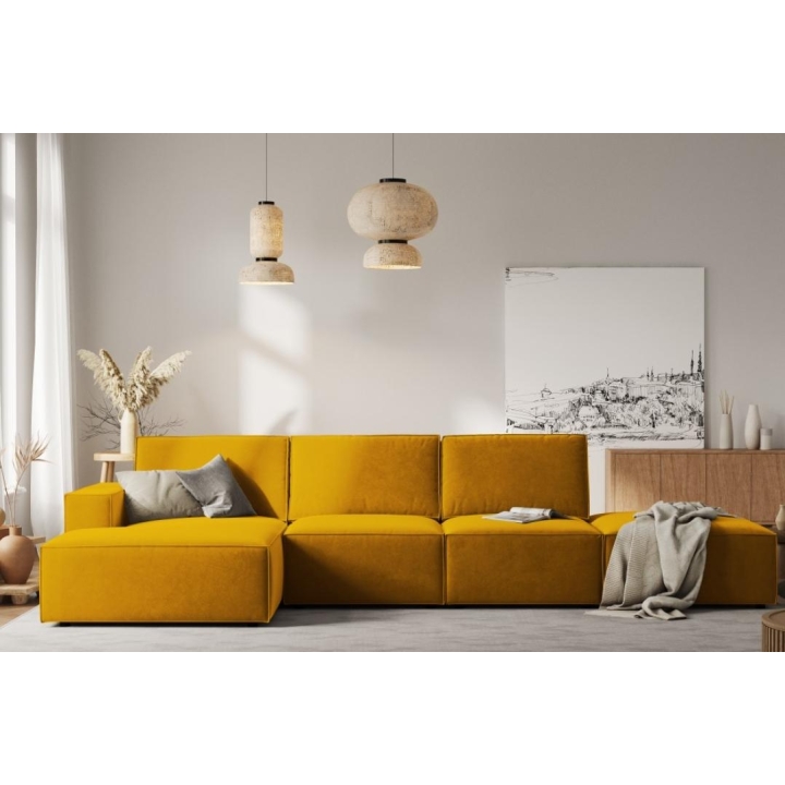 The stylish corner sofa 5 seater. Carlo by the manufacturer Milo Casais a piece of furniture with dimensions: 341 cm wide, 90 cm high, 166 cm deep, which is characterised by its extreme comfort. This trendy corner sofa is available in 7 colours: Light Beige, Royal Blue, Grey, Light Grey, Yellow, Black and Bottle Green, so it will suit any type of interior. The seat filling is made of a combination of corrugated spring and high elasticity polyurethane foam, and the backrest is filled with silicone. The sofa is distinguished by its unusual, futuristic shape - it does not have a single backrest, which makes it more spacious. The piece of furniture is upholstered with velvet fabric, silky and pleasant to the touch with a delicate sheen, which ensures the highest comfort of relaxation and is also resistant to abrasion. Martindale test of 50,000 cycles. The high-quality materials used in the production of the furniture make the Carlo corner sofa characterised by high strength and durability. The furniture is set on low, plastic legs. The sofa can be manufactured on the left or on the right, so you can better adapt the furniture to your home.