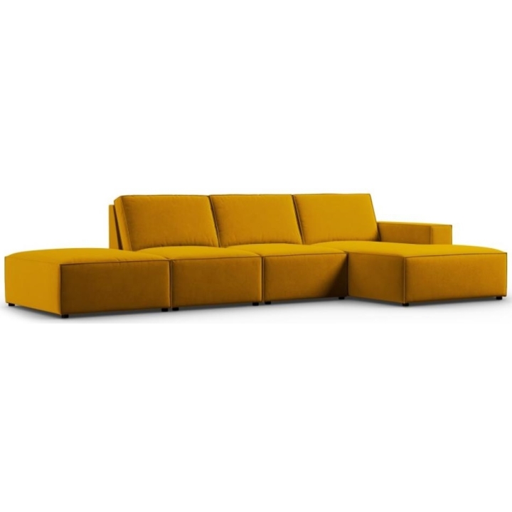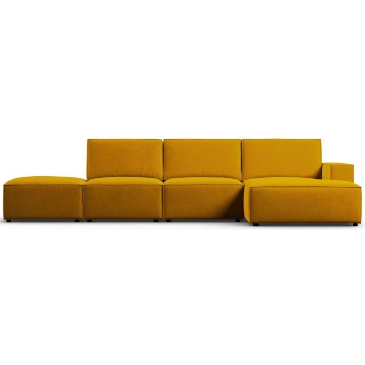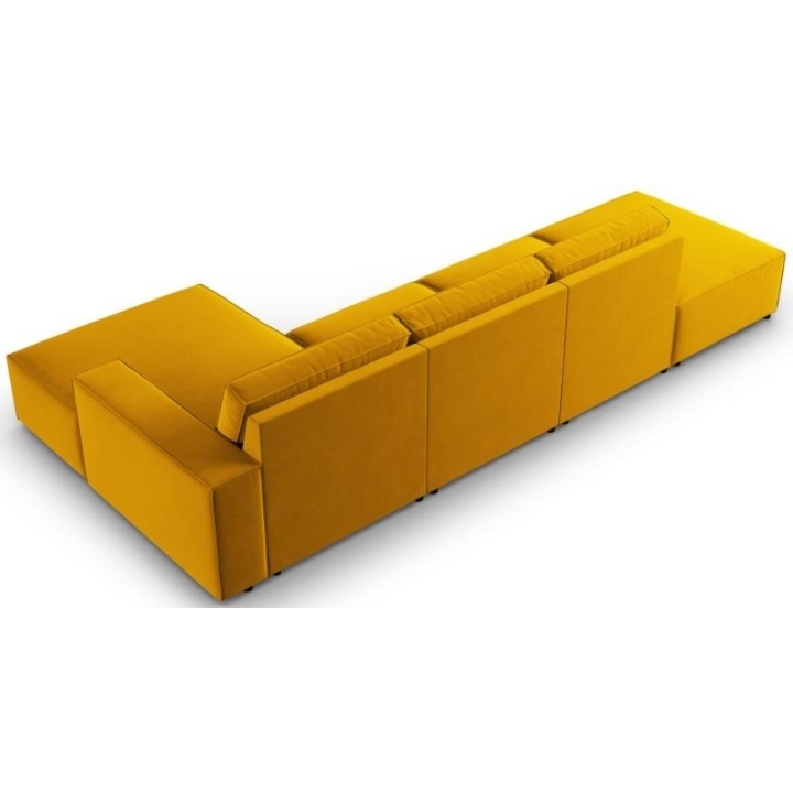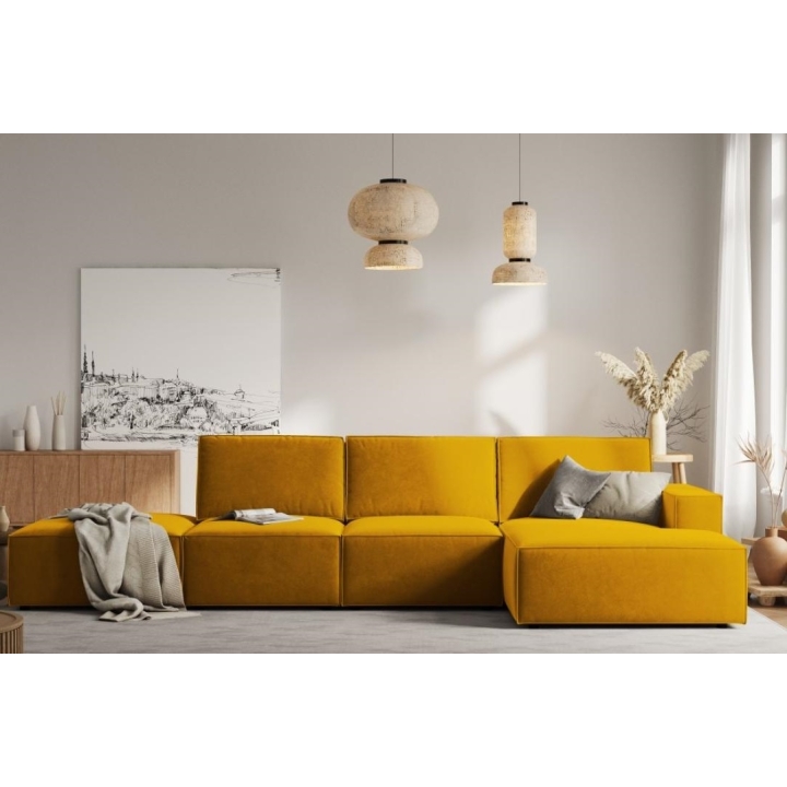 The stylish corner sofa 5 seater. Carlo by the manufacturer Milo Casais a piece of furniture with dimensions: 341 cm wide, 90 cm high, 166 cm deep, which is characterised by its extreme comfort. This trendy corner sofa is available in 7 colours: Light Beige, Royal Blue, Grey, Light Grey, Yellow, Black and Bottle Green, so it will suit any type of interior. The seat filling is made of a combination of corrugated spring and high elasticity polyurethane foam, and the backrest is filled with silicone. The sofa is distinguished by its unusual, futuristic shape - it does not have a single backrest, which makes it more spacious. The piece of furniture is upholstered with velvet fabric, silky and pleasant to the touch with a delicate sheen, which ensures the highest comfort of relaxation and is also resistant to abrasion. Martindale test of 50,000 cycles. The high-quality materials used in the production of the furniture make the Carlo corner sofa characterised by high strength and durability. The furniture is set on low, plastic legs. The sofa can be manufactured on the left or on the right, so you can better adapt the furniture to your home.