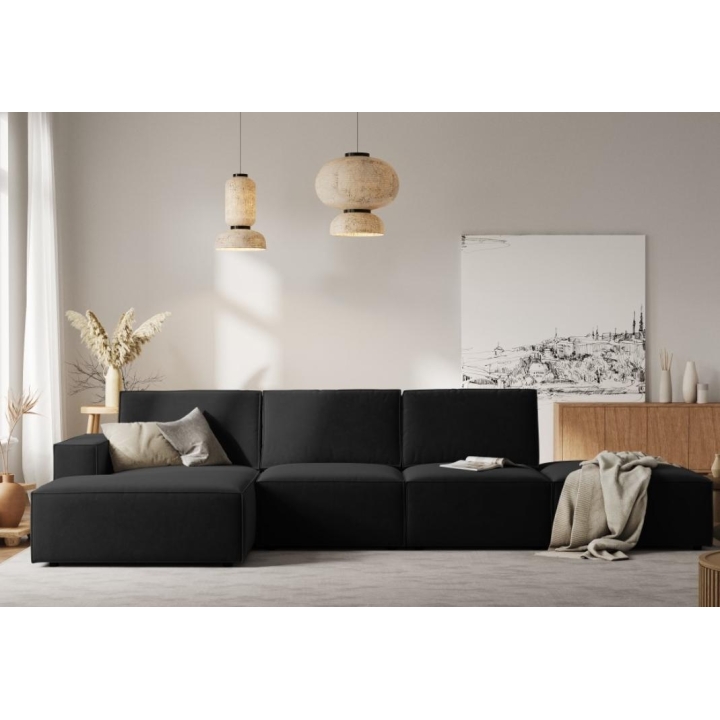 The stylish corner sofa 5 seater. Carlo by the manufacturer Milo Casais a piece of furniture with dimensions: 341 cm wide, 90 cm high, 166 cm deep, which is characterised by its extreme comfort. This trendy corner sofa is available in 7 colours: Light Beige, Royal Blue, Grey, Light Grey, Yellow, Black and Bottle Green, so it will suit any type of interior. The seat filling is made of a combination of corrugated spring and high elasticity polyurethane foam, and the backrest is filled with silicone. The sofa is distinguished by its unusual, futuristic shape - it does not have a single backrest, which makes it more spacious. The piece of furniture is upholstered with velvet fabric, silky and pleasant to the touch with a delicate sheen, which ensures the highest comfort of relaxation and is also resistant to abrasion. Martindale test of 50,000 cycles. The high-quality materials used in the production of the furniture make the Carlo corner sofa characterised by high strength and durability. The furniture is set on low, plastic legs. The sofa can be manufactured on the left or on the right, so you can better adapt the furniture to your home.