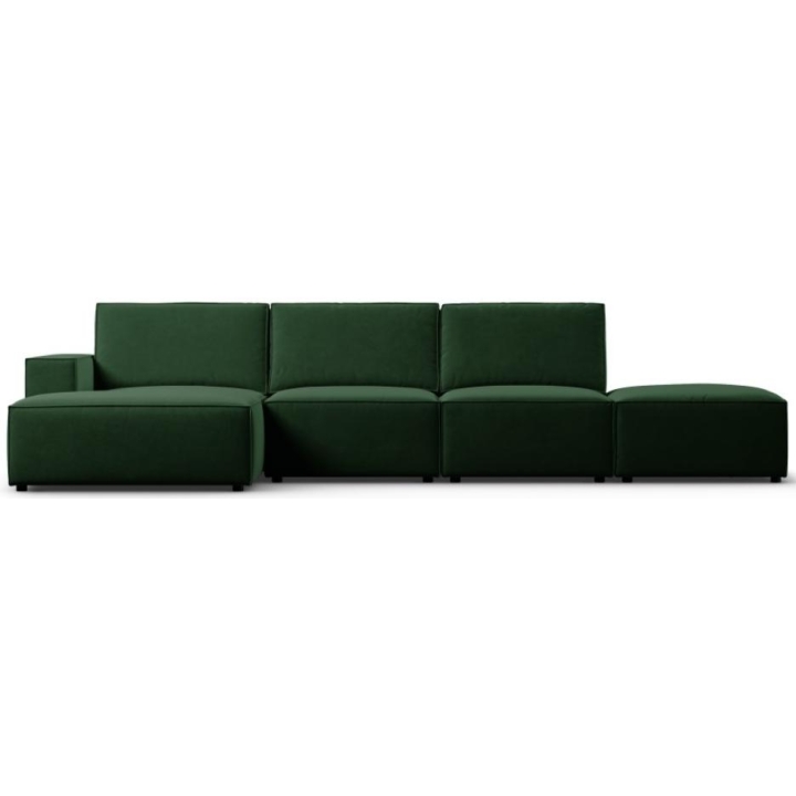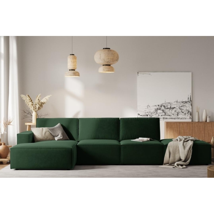 The stylish corner sofa 5 seater. Carlo by the manufacturer Milo Casais a piece of furniture with dimensions: 341 cm wide, 90 cm high, 166 cm deep, which is characterised by its extreme comfort. This trendy corner sofa is available in 7 colours: Light Beige, Royal Blue, Grey, Light Grey, Yellow, Black and Bottle Green, so it will suit any type of interior. The seat filling is made of a combination of corrugated spring and high elasticity polyurethane foam, and the backrest is filled with silicone. The sofa is distinguished by its unusual, futuristic shape - it does not have a single backrest, which makes it more spacious. The piece of furniture is upholstered with velvet fabric, silky and pleasant to the touch with a delicate sheen, which ensures the highest comfort of relaxation and is also resistant to abrasion. Martindale test of 50,000 cycles. The high-quality materials used in the production of the furniture make the Carlo corner sofa characterised by high strength and durability. The furniture is set on low, plastic legs. The sofa can be manufactured on the left or on the right, so you can better adapt the furniture to your home.
