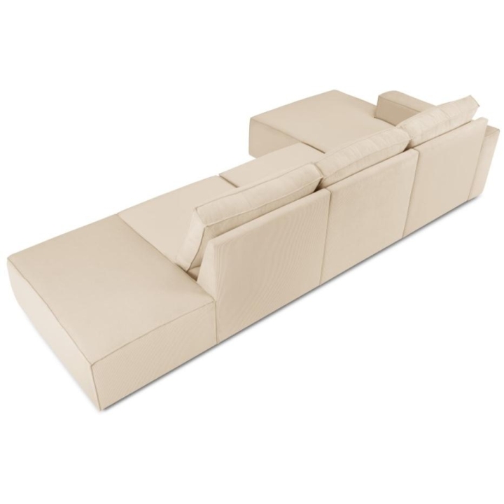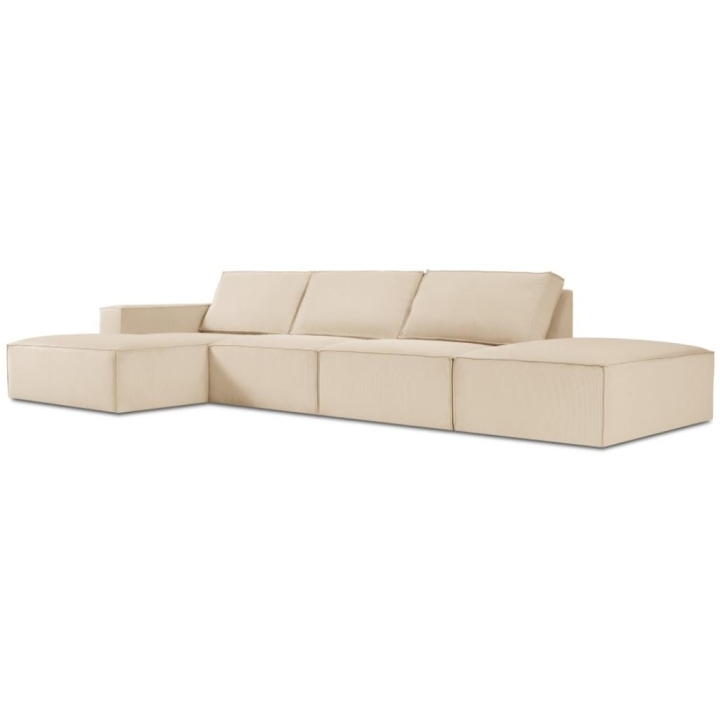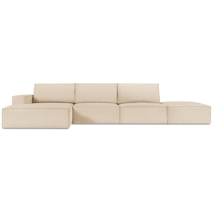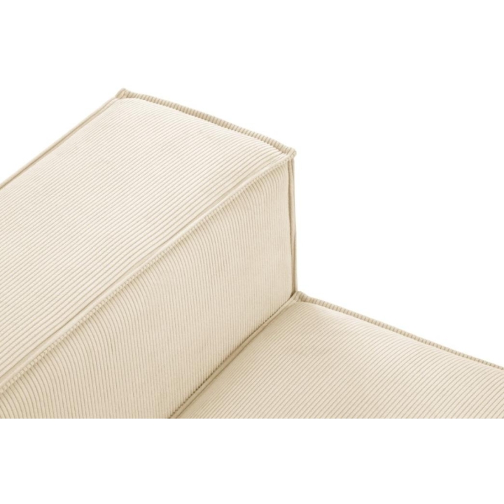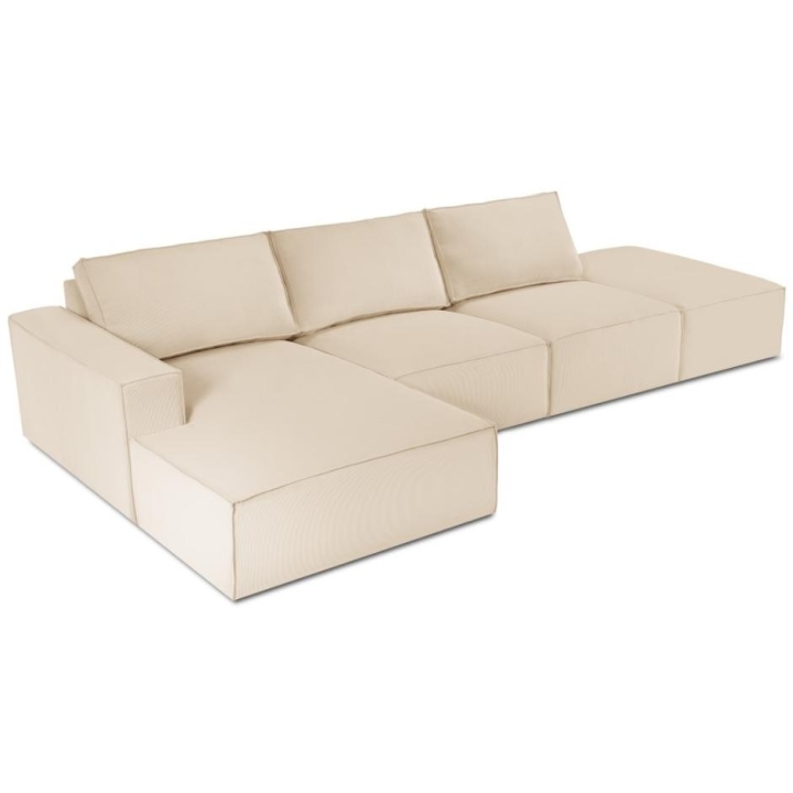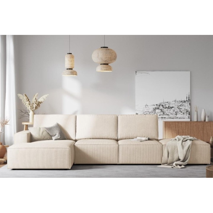 The stylish corner sofa 5 seater. Carlo by the manufacturer Milo Casa is a piece of furniture with dimensions: 341 cm wide, 90 cm high, 166 cm deep, which is characterised by its extreme comfort. This trendy corner sofa is available in 8 colours: Beige, Light Blue, Dark Blue, Grey, Light Grey, Yellow, Black and Bottle Green, so it will suit any type of interior. The seat filling is made from a combination of corrugated spring and high elasticity polyurethane foam, and the backrest is filled with silicone. The sofa is distinguished by its unusual, futuristic shape - it does not have a single backrest, which makes it more spacious. The piece of furniture is upholstered with corduroy fabric with a matt structure made of narrow 3 mm wide stripes, which ensures the highest comfort of relaxationand additionally adds elegance to the corner piece. The high quality materials used in the production ofthe furniture make the Carlo corner sofa characterised by high strength and durability. The furniture is set on low, plastic legs. The sofa can be manufactured on the left or on the right, so you can better adapt the furniture to your home.