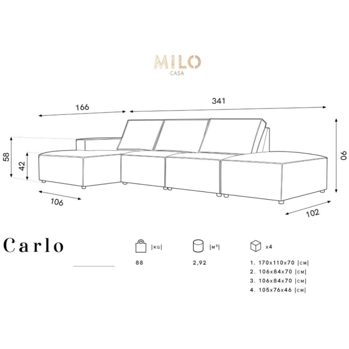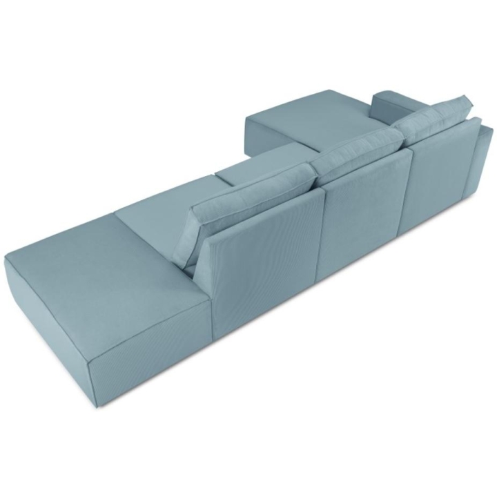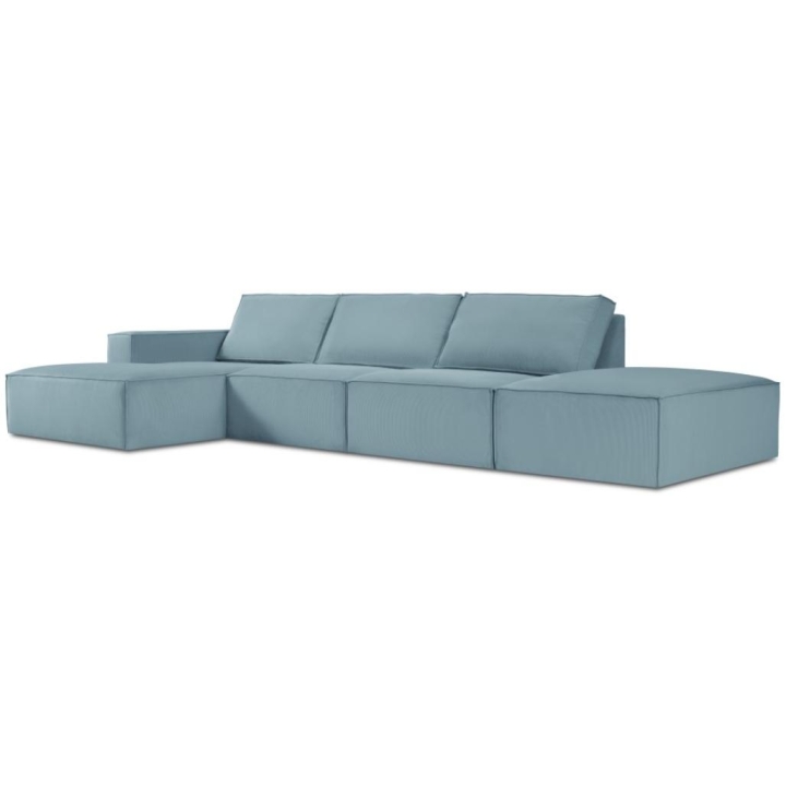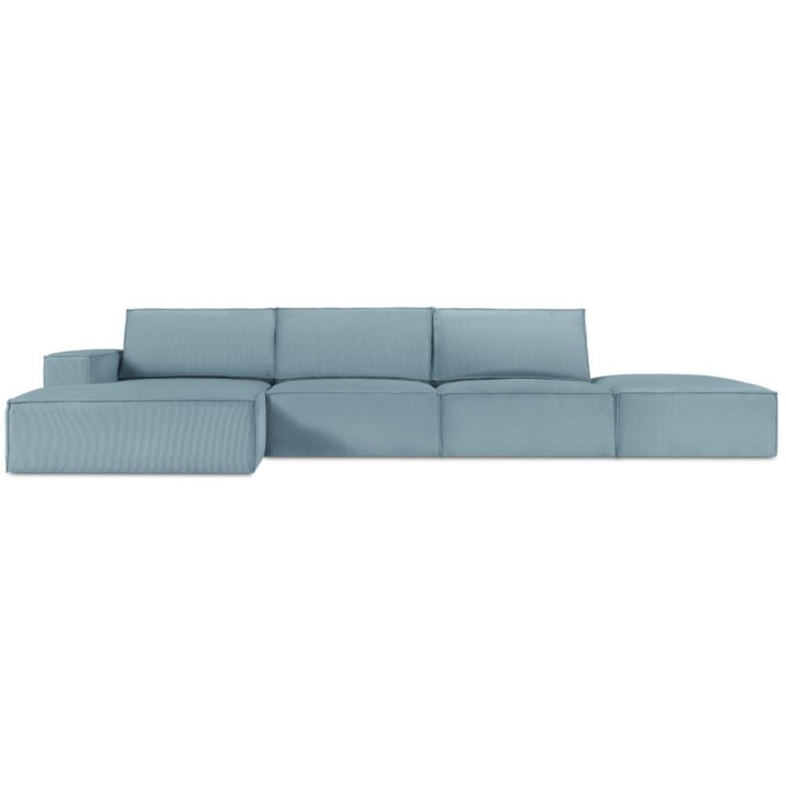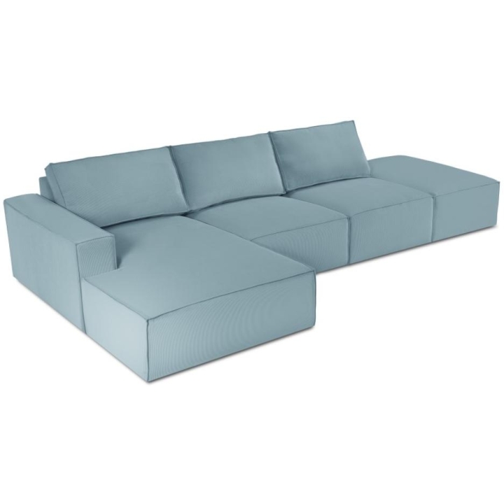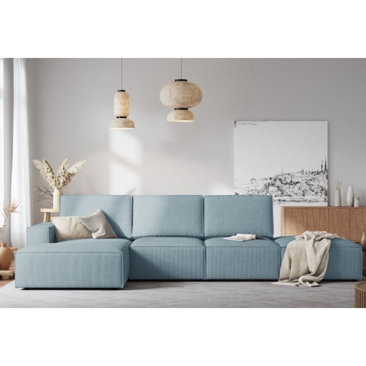 The stylish corner sofa 5 seater. Carlo by the manufacturer Milo Casa is a piece of furniture with dimensions: 341 cm wide, 90 cm high, 166 cm deep, which is characterised by its extreme comfort. This trendy corner sofa is available in 8 colours: Beige, Light Blue, Dark Blue, Grey, Light Grey, Yellow, Black and Bottle Green, so it will suit any type of interior. The seat filling is made from a combination of corrugated spring and high elasticity polyurethane foam, and the backrest is filled with silicone. The sofa is distinguished by its unusual, futuristic shape - it does not have a single backrest, which makes it more spacious. The piece of furniture is upholstered with corduroy fabric with a matt structure made of narrow 3 mm wide stripes, which ensures the highest comfort of relaxationand additionally adds elegance to the corner piece. The high quality materials used in the production ofthe furniture make the Carlo corner sofa characterised by high strength and durability. The furniture is set on low, plastic legs. The sofa can be manufactured on the left or on the right, so you can better adapt the furniture to your home.