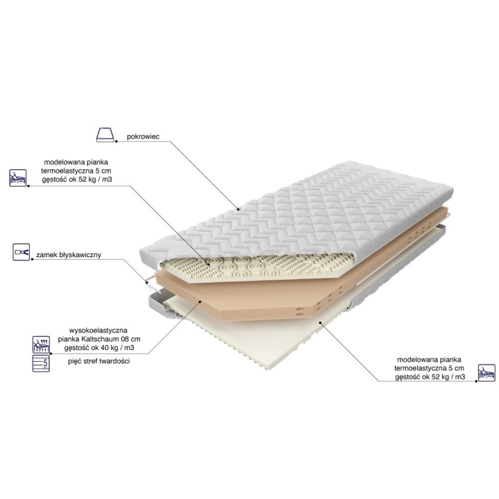 TheAmeland mattress is a product made of high-quality foam that actively changes its firmness under the influence of the temperature of the person lying down. The five zones of hardness used in the Ameland mattress means that it adapts perfectly to the natural curves of the body, providing comfort at the highest level. The use of thermoelastic foam on two sides makes the mattress double-sided. An advantage of the product is the removable cover, which can be washed for better hygiene and freshness. Foam mattress, has two levels of firmness to choose from H2 (soft), H3 (medium), adapts to the body under the influence of heat, pressure reduction and massaging, very good body support along the entire length, five zones of firmness. Construction: Insert: 8cm Kaltschaum 5-field high-flexible foam, 5cm of modelled Bio Memory foam on both sides. Cover: Your choice from the Exclusive range, height: approx. 18cm. Please select your mattress size by clicking on the 'Size selection' button. Price before selection applies to mattress size 80x200cm.