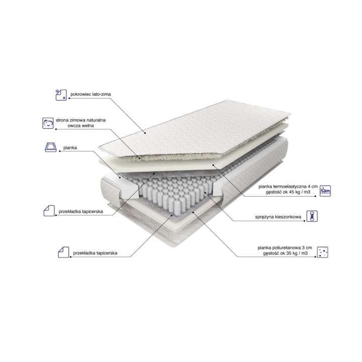Estrella Visco is a modern proposal from MK Foam Kolo, guaranteeing a feeling of comfort and convenience and, above all, quietness when changing position during sleep. The mattress consists of sac springs and high-quality wire. It is encased on both sides with an upholstery divider, and on one side with T-35 30 mm polyurethane foam with increased resilience. The mattress also has a layer of thermoelastic foam. Its surface adheres perfectly to the shape of the body, providing favourable conditions for rest and regeneration. The mattress also has a cover with anti-allergenic properties that prevent the proliferation of bacteria and fungi. Features: pocket mattress, removable cover, flexible, quiet and peaceful sleep, excellent regeneration during sleep, anti-allergic properties. Design: Contribution: pocket spring, upholstery divider on both sides, 4cm Visco foam on one side, 3cm T35 polyurethane foam on the other side. Cover: Summer/Winter, height: approx. 20 cm. There are approximately 255 springs per square metre of mattress surface. Please select the size of the mattress by clicking on the "Select size" button. The price before selection is for a mattress size 80x200cm. The mattress does not have a frame.