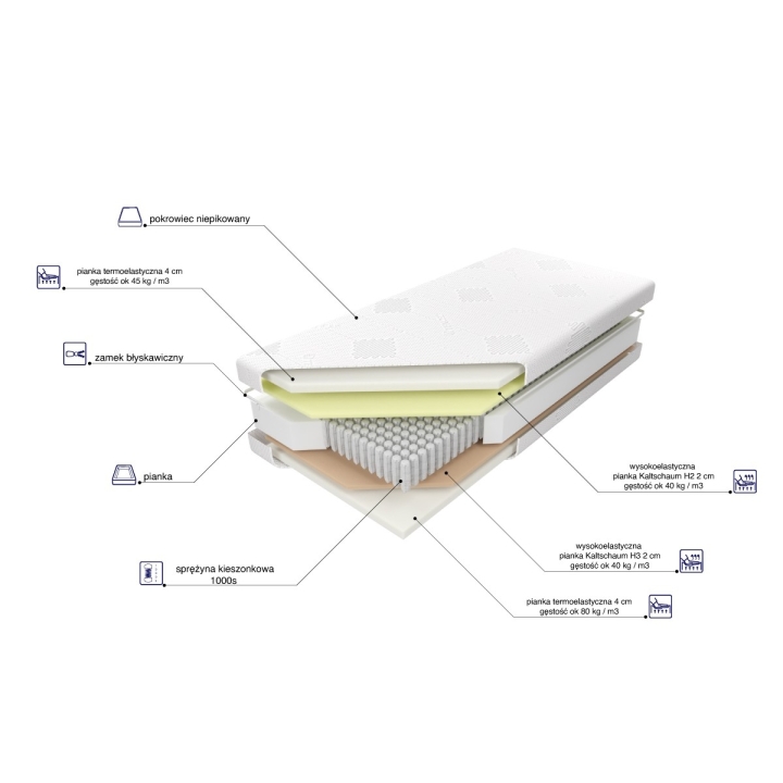 The Laguna mattress from MK Foam Koło has been made with pouch springs made from high-quality wire. They are located in separate pockets increasing the independence of individual springs and thus improving the elasticity of the mattress. They perfectly adjust to the shape and weight of the body and take the natural shape of the spine ensuring excellent comfort. There are 1344 springs in the Laguna 1000 S mattress measuring 140x200 cm. The spring insert is upholstered on both sides with upholstery mesh. On one side there is Kaltchaum H3 foam, which has anti-allergic properties and prevents the development of dust mites. This foam reacts to the temperature and weight of the body. It becomes softer where the body comes into contact with the mattress surface. On the other side there is Kaltschaum H2 foam. The Laguna mattress comes in a variety of covers to choose from. The cover has a divider zip that allows it to be removed and washed.