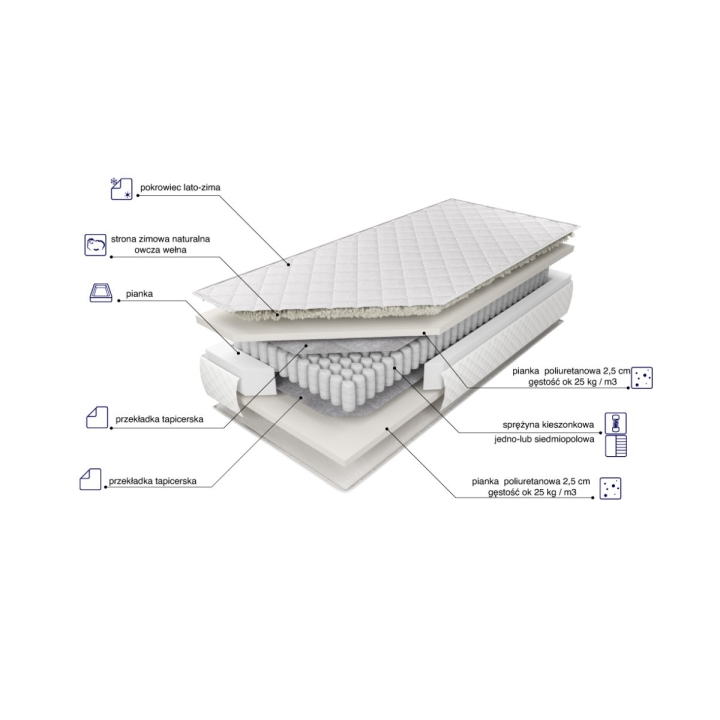 The TEXEL is a pocket mattress from MK Foam Koło, which consists of high-quality pocket springs that guarantee the independent work of each one. As a result, it perfectly mimics the shape of your figure and adapts to the natural curves of your spine, preventing back pain when standing up. In addition, the springs cushion the 'rocking' effect, which translates into a quiet and restful sleep. The mattress is also made of polyurethane foam and an upholstery divider, which guarantees long-lasting use. Characteristic features of TEXEL include elasticity, quiet and restful sleep, antibacterial properties, good body cushioning and uniform firmness over the entire surface. It also provides excellent recovery during sleep. The mattress is equipped with a pocket spring, an upholstery divider on both sides and 2.5 cm of T25 polyurethane foam. The cover is available in different variants such as Summer/Winter, Allergic, Aloe Vera or Ultraphil, with a height of approximately 18 cm for the quilted cover.