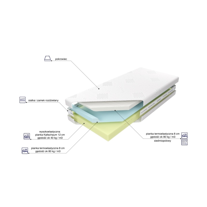 Medivis Lux Komfort is a foam mattress made on the basis of high-flexible foam with seven comfort zones. The mattress also includes thermoelastic foam with antibacterial properties. The thermoelastic foam used in the Medivis Lux Komfort mattress also has exceptional pressure reducing properties, evenly distributing the body weight over the mattress surface. Thanks to this, the surface of the mattress perfectly adapts to the shape of the body, providing comfort at the highest level.