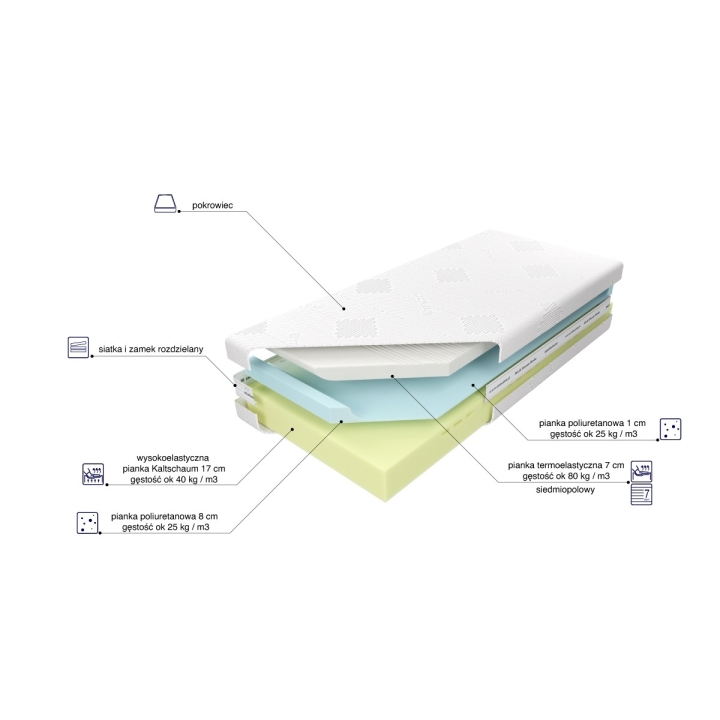 Medivis Lux Komfort 25 is a foam mattress, which is filled with a thick layer of 7-field revolutionary thermoelastic foam and HR high elastic foam. The mattress has anti-bacterial properties, so it is ideal for allergy sufferers. The use of thermoelastic foam makes the surface of the mattress soften and perfectly adapts to the shape of the body, maintaining its anatomical structure during sleep. The mattress will prevent bothersome pressure and numbness of limbs. The insert is divided into seven hardness (comfort) zones, making the mattress even more adaptable to the body.