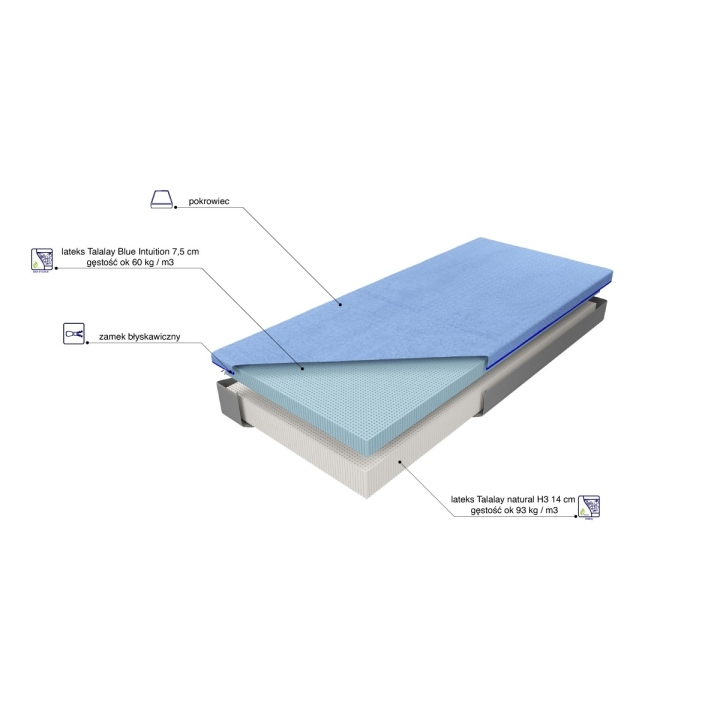 Medivis Talalay Blue H3 is a mattress made of Talalay Natural H3 latex 14 cm high, combined with the modern Talalay Blue Intuition latex 7.5 cm high. The mattress is sure to improve the quality of your sleep and promote better recovery. The unique structure characterised by open cells provides comfort and proper support for the spine and increases the level of air circulation. Which also prevents the growth of bacteria, fungi or dust mites. Talalay Blue, based on natural latex, has thermoregulatory properties to reduce perspiration and prevent overheating. The product is extremely resistant to deformation thanks to the use of an additional inner cover, and retains its shape and properties for many years. The mattress with a hardness of H3 is recommended for people weighing more than 80 kg.