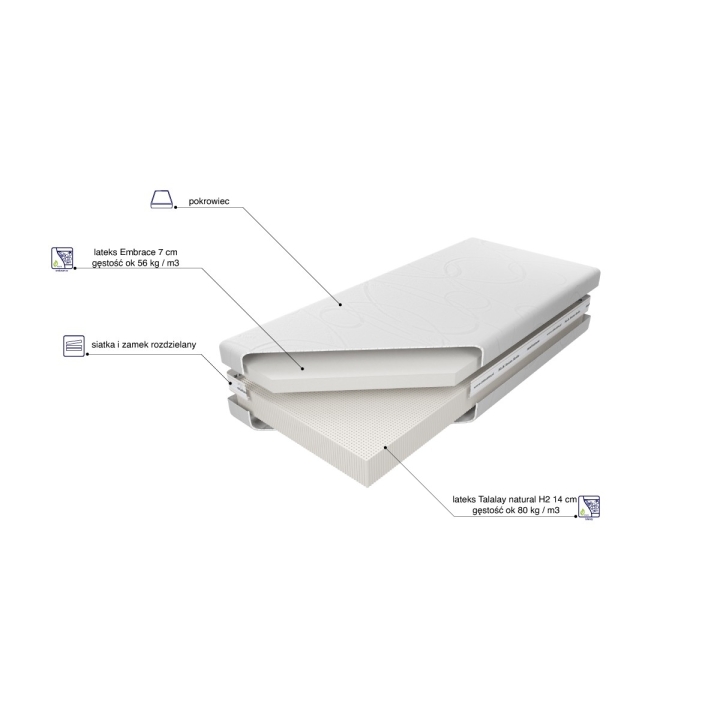 Medivis Talalay Embrace H2 is an approx. 21 cm high mattress It has 2 layers of latex. The first layer consists of a 7 cm layer of extremely flexible Talalay Embrace latex, combining the advantages of Talalay latex and thermoelastic foam. It has temperature regulating properties. It can adapt perfectly to the body and cushions the body at rest. The high air circulation is due to the open-cell structure. In turn, the 14 cm layer of Talalay Natural H2 latex, whose structure contributes to excellent ventilation, provides comfort and optimal support for the sleeper. The mattress has an additional inner cover, providing greater protection for the insert and thus preventing deformation.