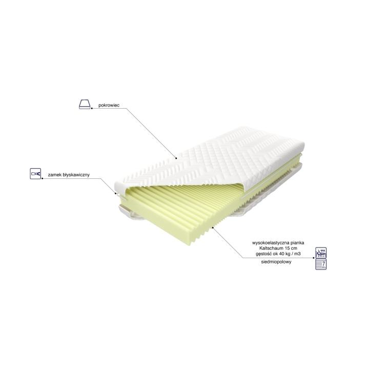 Inset: 15cm Kaltschaum high-flexible foam with H2 or H3 firmness, both sides contour-cut in waves, 7-field mattress.