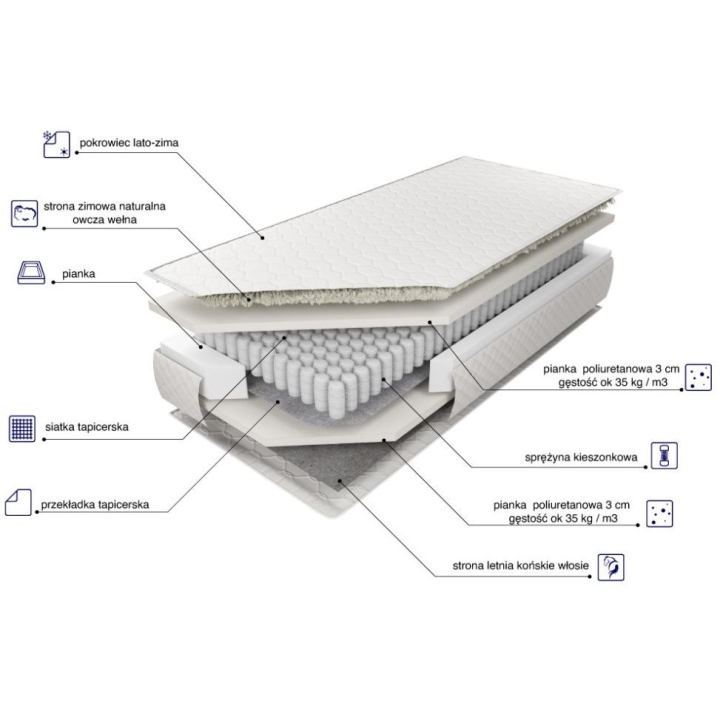 Contribution: pocket spring, upholstery spacer on one side, upholstery mesh on the other side, 3cm of T35 polyurethane foam on both sides.