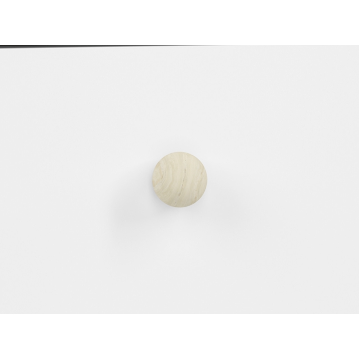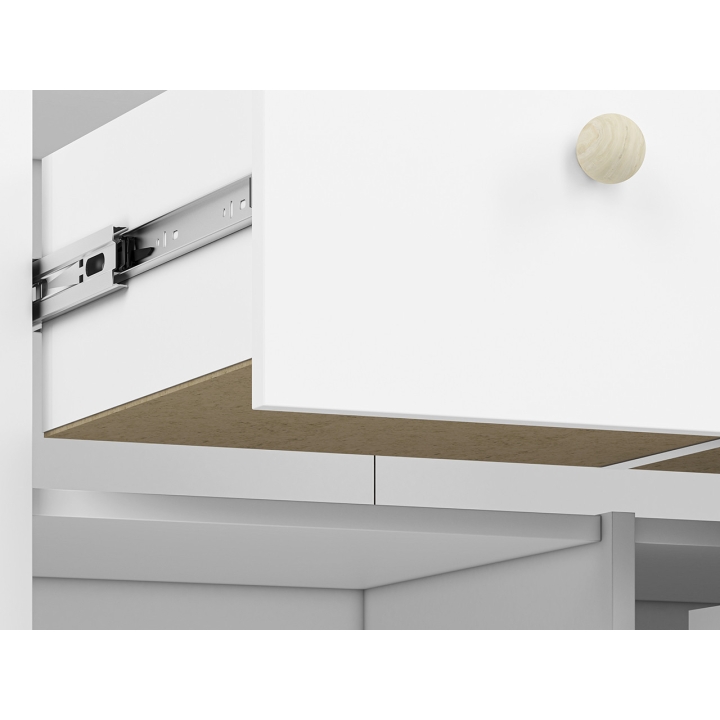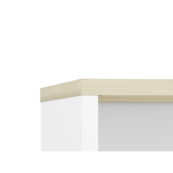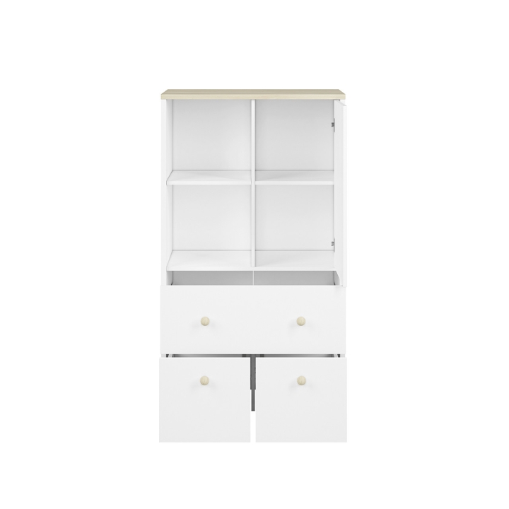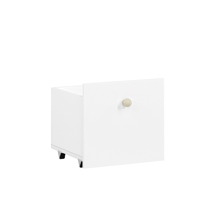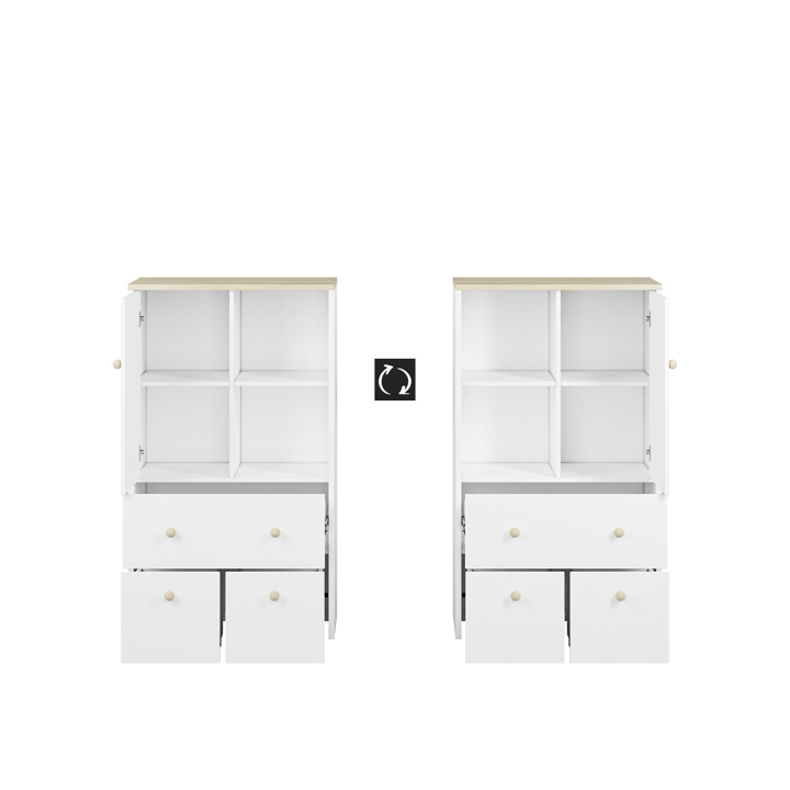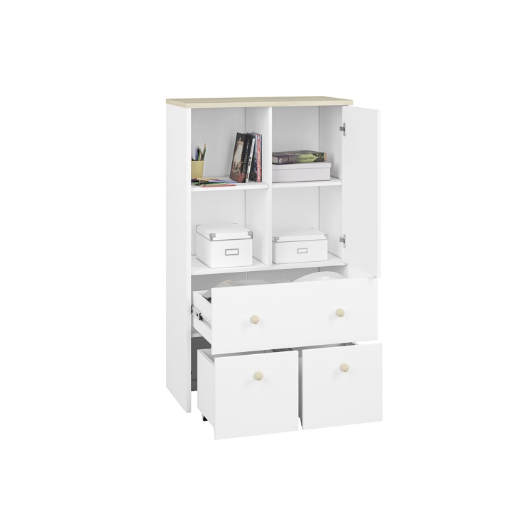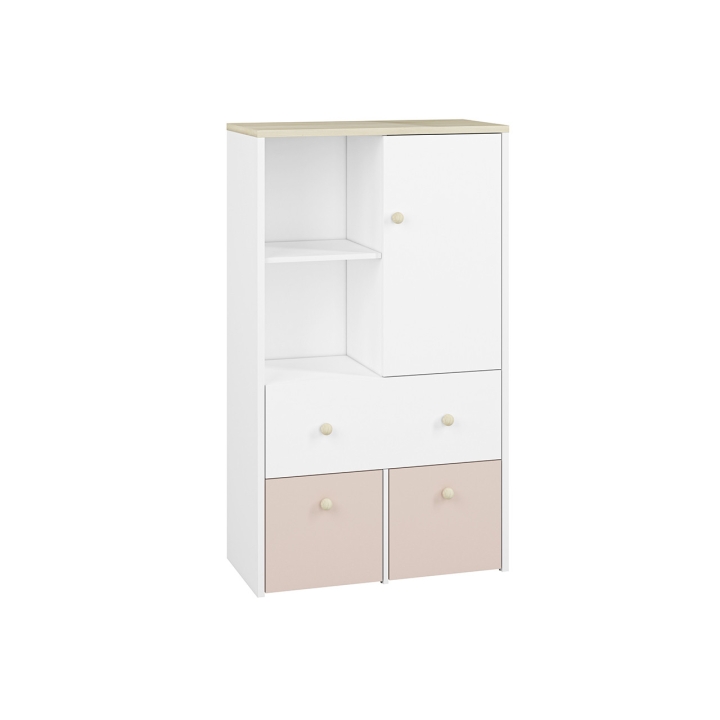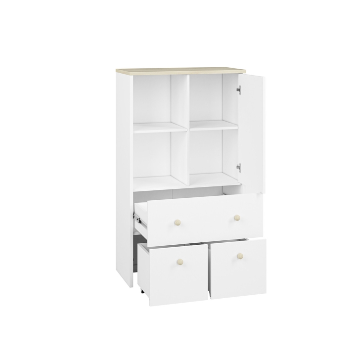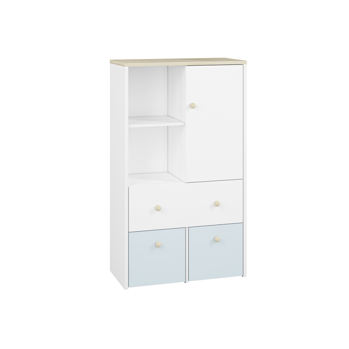 Elmo 08 chest of drawers is a piece of furniture belonging to the bestselling Elmo collection of youth furniture, created by the well-known and valued ML Meble brand. The modern design of this piece of furniture, combined with bright colours, will fully meet the expectations of every child and their parents. Thanks to its universal design, the Elmo 08 chest of drawers will perfectly complement the decor of both a baby's room and a teenager's room. The chest of drawers is made of high-quality laminated board in white, fully resistant to mechanical damage (scratches, cracks, impacts), as well as moisture and high temperatures. In addition, the edges of the chest of drawers have been reinforced with ABS edges, which means the material will not peel or deform. Elmo 08 is a piece of furniture featuring one cabinet with doors and two shelves inside, two open shelves, as well as three drawers - one larger and two smaller. A stylish round handle adds to the overall look. It is possible to purchase a different colour for the front of the lower drawers - white is standard.