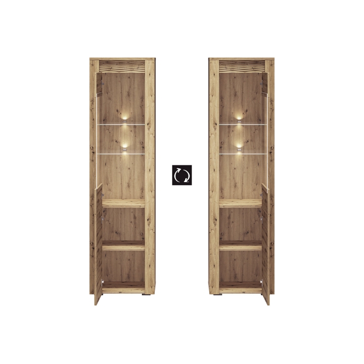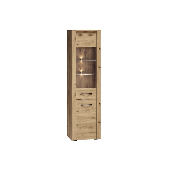 Are you looking for a stylish piece of furniture that will allow you to organise your interior well? If so, the display cabinet from the Artis collection will be perfect for this role. Undoubtedly, the use of a glass display cabinet will positively influence the look of your interior and give it a unique shine. The natural grain of the wood, beautiful grain and clear knots emphasise the character of the furniture. In combination with a balanced and simple design, they form an original duet which will transform any interior. A decorative groove and LED lighting add charm. The furniture is equipped with three wooden shelves and two glass ones. The glazing will allow you to display your most interesting treasures in style! While the black metal handles contrast perfectly with the warm oak decor.