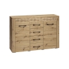 Are you looking for a capacious chest of drawers for your living room? The Artis collection chest of drawers will do the job perfectly! The furniture will not only provide plenty of storage space, but also looks very modern and stylish. The chest is equipped with four capacious drawers and two closed cabinets. The black metal handles are a great contrast to the warm oak decor, giving the piece a unique atmosphere. The natural grain of the wood, beautiful grain and clear knots emphasise the character of the furniture. In combination with a balanced and simple design they form an original duo which will change any interior. A decorative groove adds charm. The furniture was made of high quality laminated board, resistant to scratches, moisture and high temperature. In addition, the furniture was reinforced with ABS edging, which guarantees durability, resistance to damage and an aesthetic finish.
