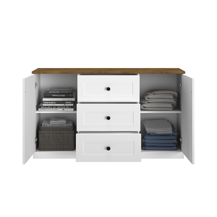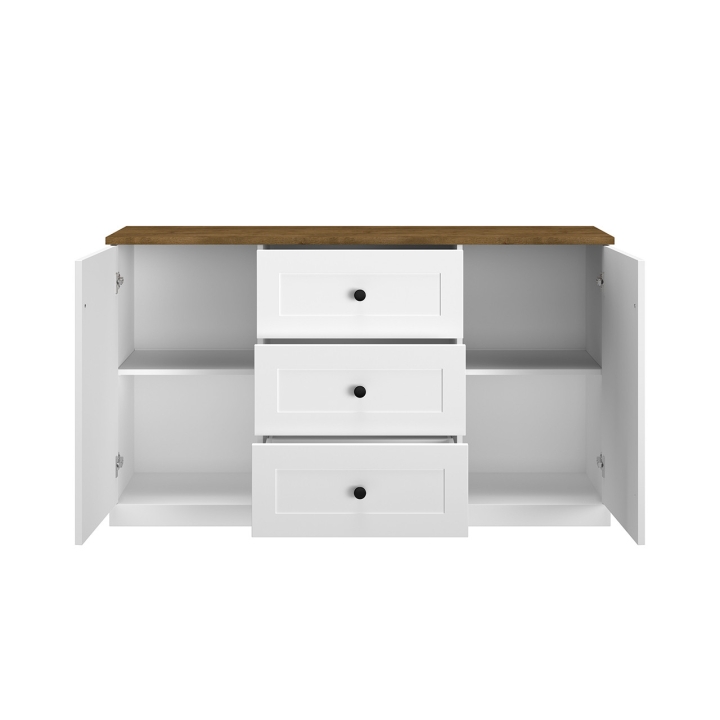 The modern Lille 06 chest of drawers is a multifunctional proposal that cannot be missing from your home. The Lille chest of drawers will help you effectively organise many useful things, impressing with its modern design at the same time. The piece stands out thanks to its intriguing form, which refers to the best features of Provencal style. The Lille chest of drawers is equipped with three capacious drawers and two closed cabinets with shelves. The capacity of the drawers has been increased thanks to the special reinforcement of the bottom. There is also a comfortable full-extension system and a soft-closing system. The Lille 06 chest of drawers impresses , thanks to its bright colours, decorative milling on the fronts and black handles.