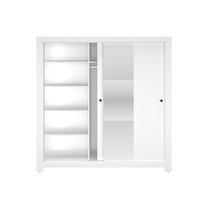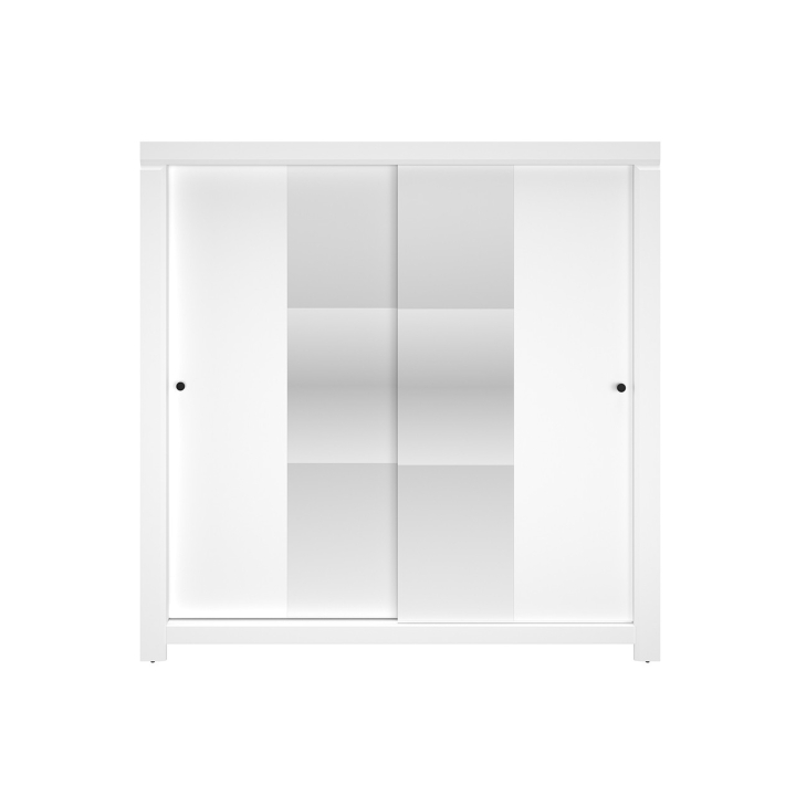 The two-door wardrobe from the Lahti collection is a modern piece of furniture characterised by its simple form, stylish design and great functionality. The Lathi wardrobe will be perfect for a bedroom as well as a wardrobe, offering a very rich interior. Equipped with practical shelves, a hanger bar and a sizable space just below it, it ensures that you can easily organise all your clothes, shoes or accessories. The matt white fronts have been enriched with a milled strip, giving the simple form a delicate and contemporary look. Black metal handles add character. While the doors with a soft-closing mechanism guarantee satisfaction during everyday use.