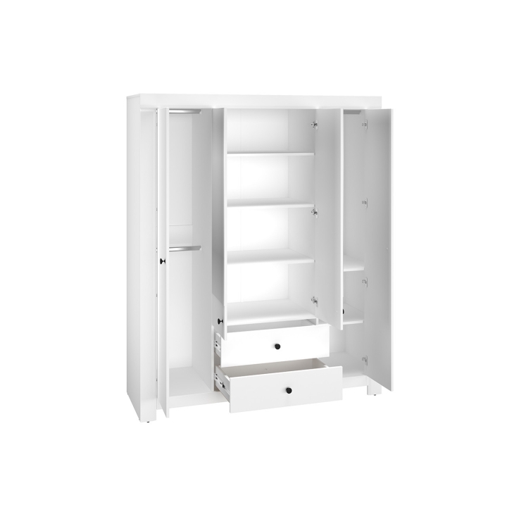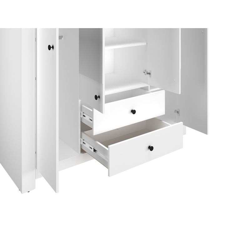 Are you looking for a capacious wardrobe for your interior? The capacious wardrobe from the Lahti 02 collection will turn out to be a perfect solution. Equipped with a four-door front, it conceals a surprising amount of space, where you will be able to freely sort your things. In addition, capacious drawers have been installed at the bottom of the furniture, which will be perfect for storing laundry. The Lahti wardrobe is not only functional, but also beautiful and stylish! The matte white furniture has been enriched with a milled strip, thanks to which the simple form has acquired a delicate and contemporary look. Black metal handles add character to the furniture. The furniture's strengths also include drawers with a full-extension function and cabinet doors with a soft-close, which guarantee satisfaction during everyday use, as they are almost noiseless.