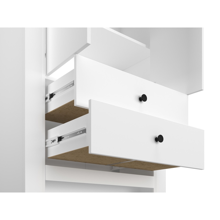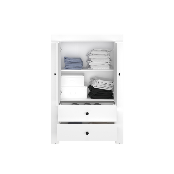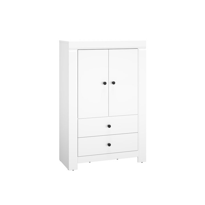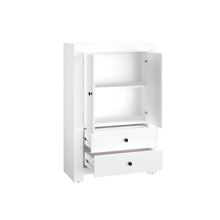 The Lahti 08 chest of drawers is a stylish piece of furniture that impresses with its extraordinary functionality. It will perfectly complement the interior design, while providing plenty of storage space. The chest is equipped with two closed cabinets with shelves and two capacious drawers. The model captivates with its subtle colouring of classic white, which perfectly harmonises with many arrangements and styles. The matte white fronts have been enriched with a milled strip, giving the simple form a delicate and contemporary look. The black handles also look great, adding character to the piece. Capacious drawers with a full-extension function and cabinet doors with a soft-closing function guarantee satisfaction during everyday use.