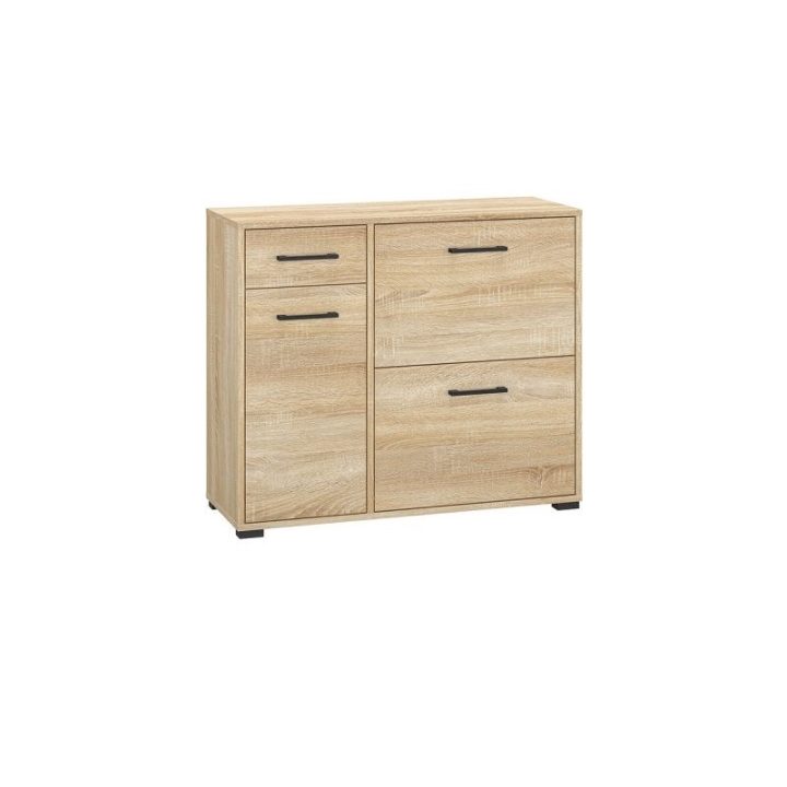 The Caro 08 shoe cabinet from manufacturer ML MEBLE is the ideal space for shoes and accessories. It consists of two horizontal cabinets and one vertical one. Each of them is divided by a shelf, allowing for proper segregation of shoes and other items. A handy drawer accommodates the most necessary shoe care accessories such as polishes, brushes and cloths. Contrasting elements in light Sonoma oak and black make the cabinet match both lighter and darker rooms. To complete the perfect furniture set, or to find an alternative, we invite you to get other products from the Caro collection by ML MEBLE manufacturer available in our offer.