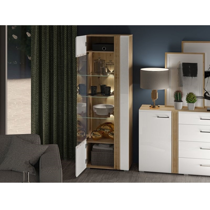 The Adagio 02L vitrine from the manufacturer ML MEBLE is a perfect colour harmony combined with a modern design. The carcass and inserts in the colour of Castello Oak perfectly match the fronts in white gloss and glazing elements. The door leaf (right) has MDF elements allowing us to hide items we do not want to display and a large glazed section allowing us to display decorations, memorabilia and tableware. A soft-closing system ensures that the furniture is quietly used. The front also features an elegant wooden insert with vertical mouldings. In order to complete the perfect set of furniture, or find an alternative, we invite you to buy other products from the Adagio collection by ML MEBLE manufacturer available in our offer. A version of the chest of drawers with doors on the left side is on offer in our shop.