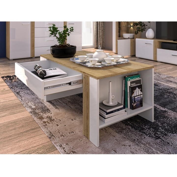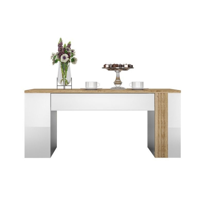 The centre of every living room is a table that will be used by household members and guests. The Adagio 10 table from manufacturer ML Meble is an excellent choice for those looking for an elegant piece of furniture with additional functionalities. The base made in white gloss perfectly harmonises with the top and milled inserts in oak. In addition to its distinctive design, the bench has additional functionality in the form of a drawer and side shelves integrated into the legs. The shelves will allow you to place books and decorative items, while the drawer equipped with a full-extension system will make it easy to access handy items such as remote controls, controllers or favourite magazines. To complete the perfect set of furniture, or to find an alternative, we invite you to get other products from the Adagio collection by ML MEBLE manufacturer available in our offer.