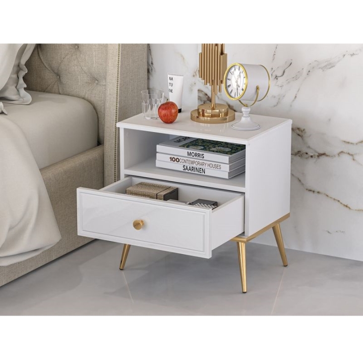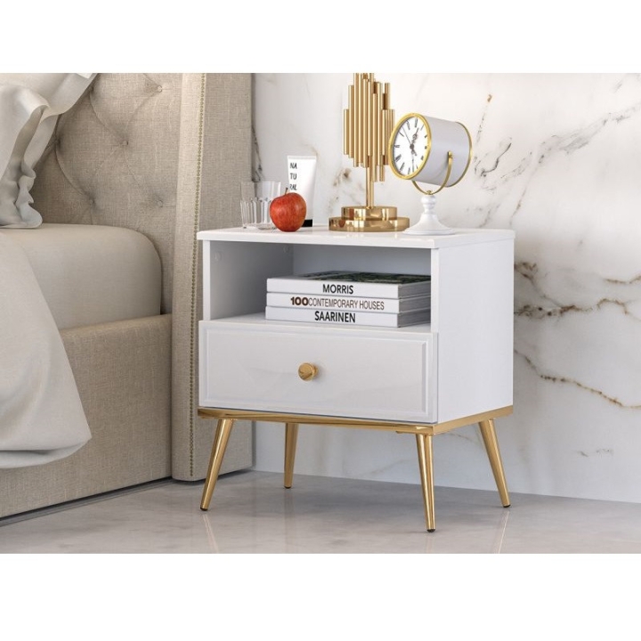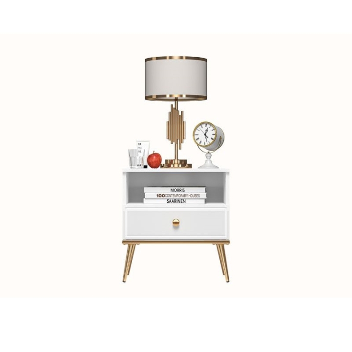 The modern Goldin 07 Nightstand from the manufacturer ML MEBLE is an incredibly useful, handy space for the most necessary things. It will successfully accommodate a lamp, your favourite book, alarm clock or other things necessary in your sleep and rest zone. It has a sturdy top, an open shelf and a drawer. The standard high gloss fronts create a perfect composition with the gold legs, handle and decorative trim. The high legs will facilitate access for the stand-alone hoover. To complete the perfect furniture set, or to find an alternative, we invite you to get other products from the Goldin collection by ML MEBLE manufacturer available in our offer.