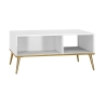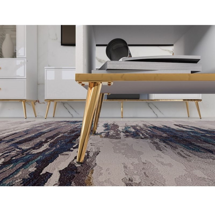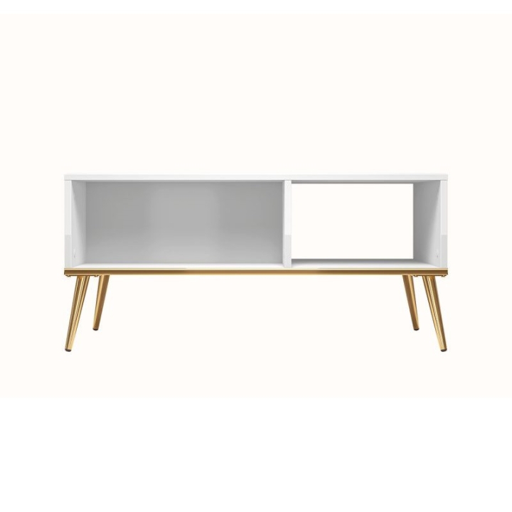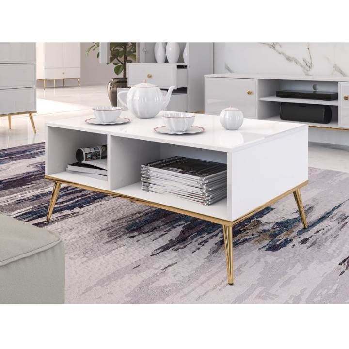 Goldin 07 table from manufacturer ML MEBLE made of white furniture board and glossy MDF. Details in the form of gold legs and decorative trim create a beautiful colour combination for a modern, elegant living room. There are three shelves under the top - one through and two at the front and back, separated by a panel. The MDF top is durable and resistant to scratches and moisture. The table stands on tall metal legs, so it is easy to keep it clean underneath, and it also facilitates access for stand-alone hoovers. To complete the perfect furniture set, or to find an alternative, please look for other products from the Goldin collection by ML MEBLE manufacturer available in our range.