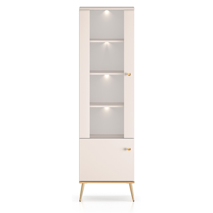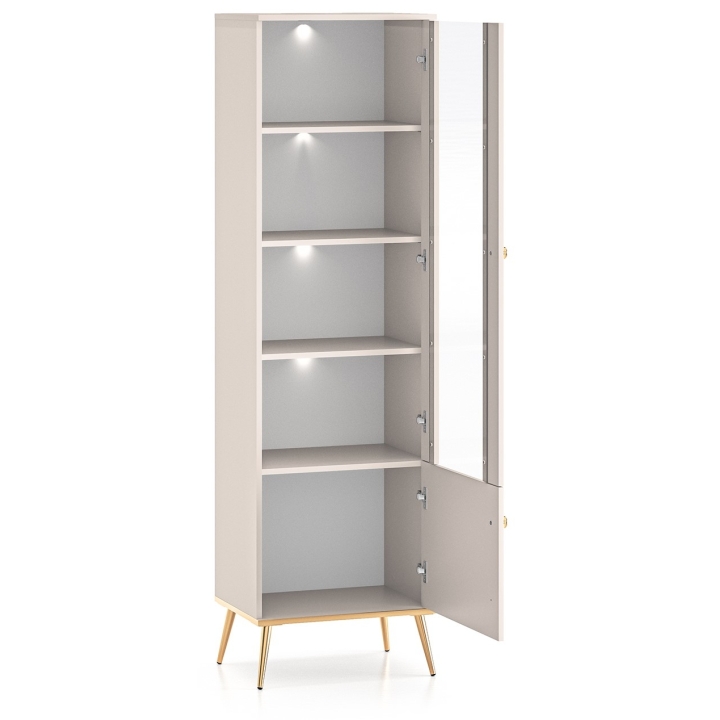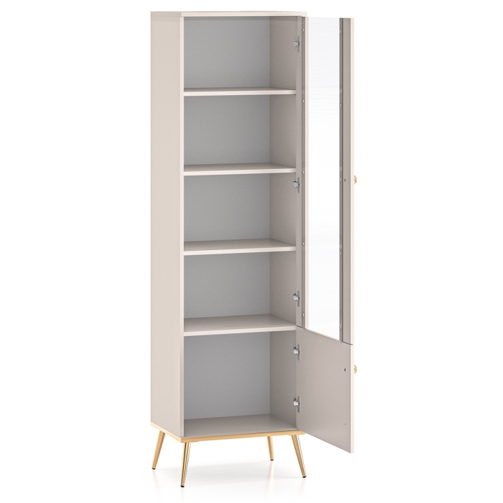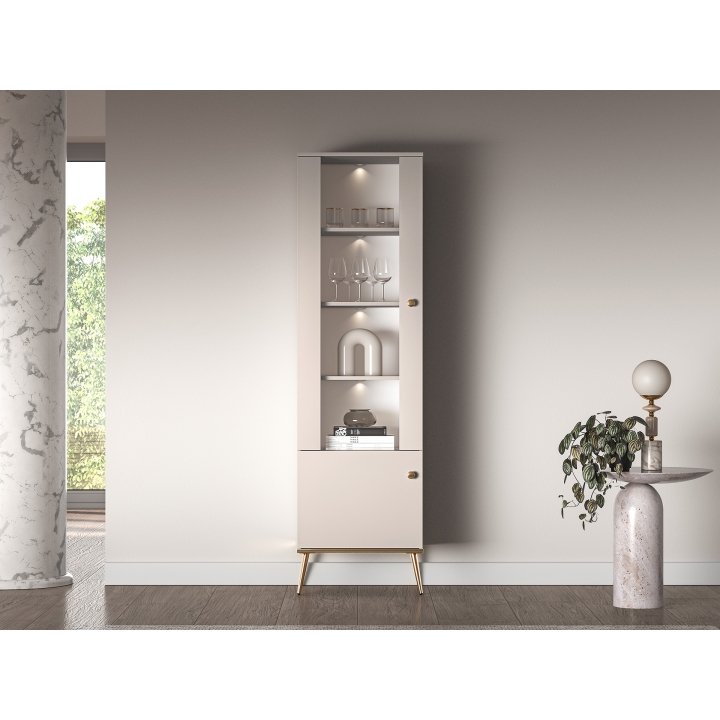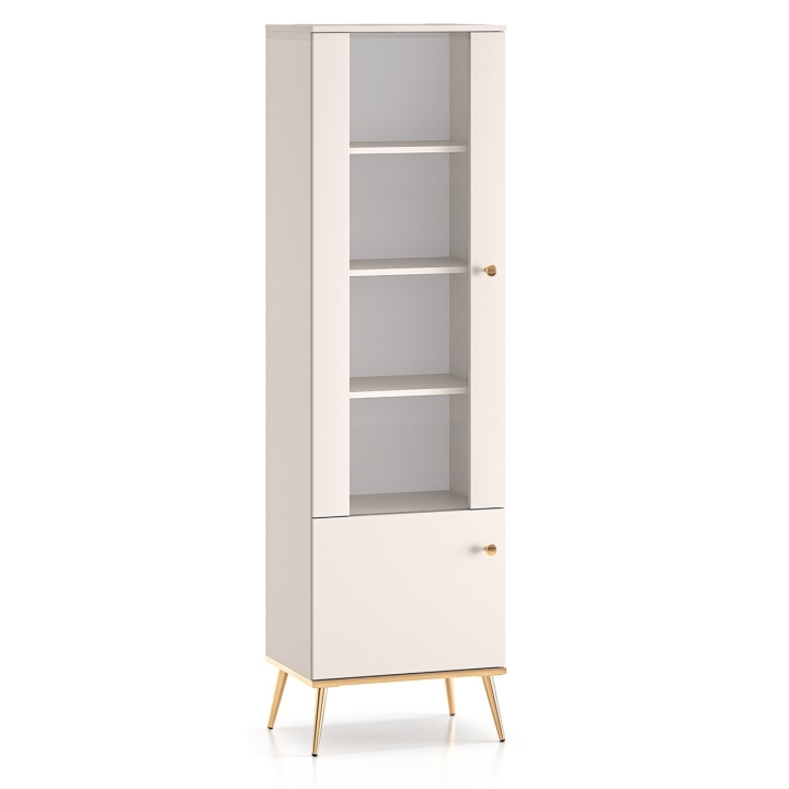 The aesthetically pleasing and functional Shirley display cabinet with glass doors is the ideal solution for the living room and dining room. Its modern design combines beauty with storage capacity. Made of laminated chipboard in Coastal Oak Evoke and Anthracite shade, with MDF and tempered glass fronts, set on high metal legs. Asymmetrical fronts with a soft-close and timeless handles add elegance. Perfect for industrial and eclectic interiors with large mirrors and natural stone, creating a stylish composition. The main advantages of the Shirley cabinet are modern design, durable materials and functionality. Glazed doors and asymmetrical fronts add elegance, while the capacious interior provides practical storage. Metal legs and a silent closing system emphasise its high quality and style.