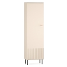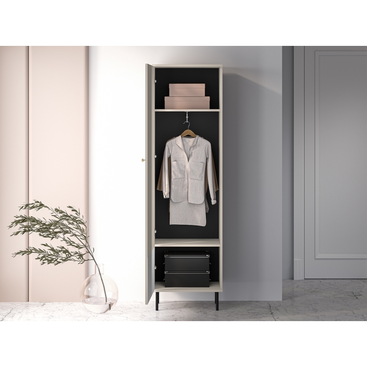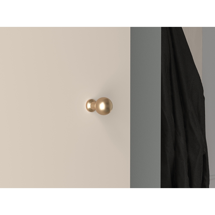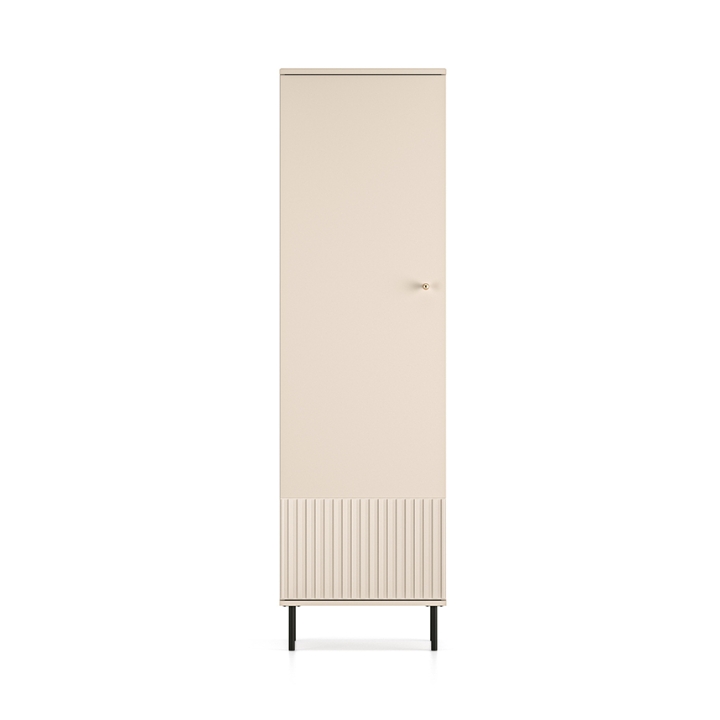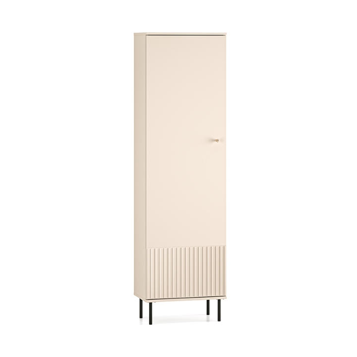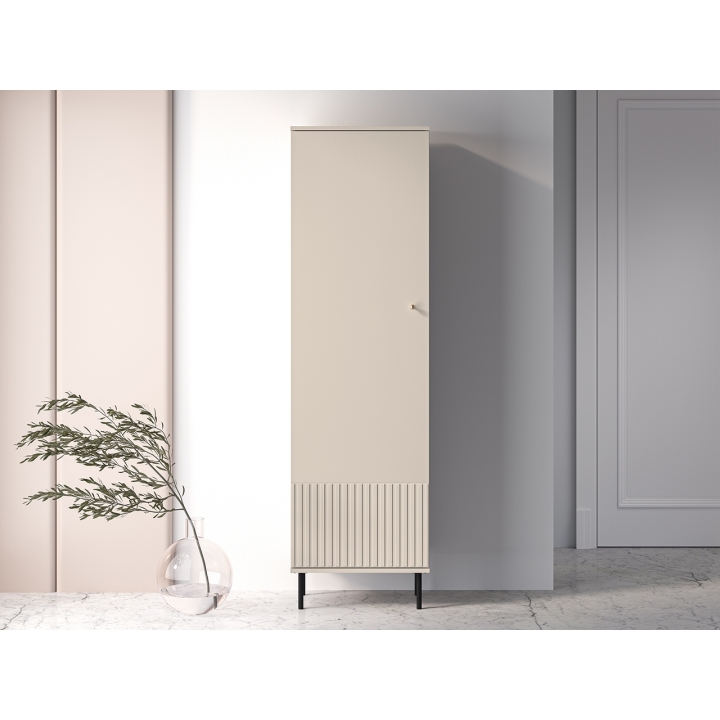 The aesthetic of the Sophie cabinet impresses with its cashmere finish, which emphasises its modern character and brings an elegant touch to the interior. The milled MDF fronts add subtle texture, while the gold metal handles, with a brushed finish, create a harmonious whole. The black high legs not only add visual lightness to the piece, but also make it easier to clean underneath the furniture, which is particularly practical for everyday use.